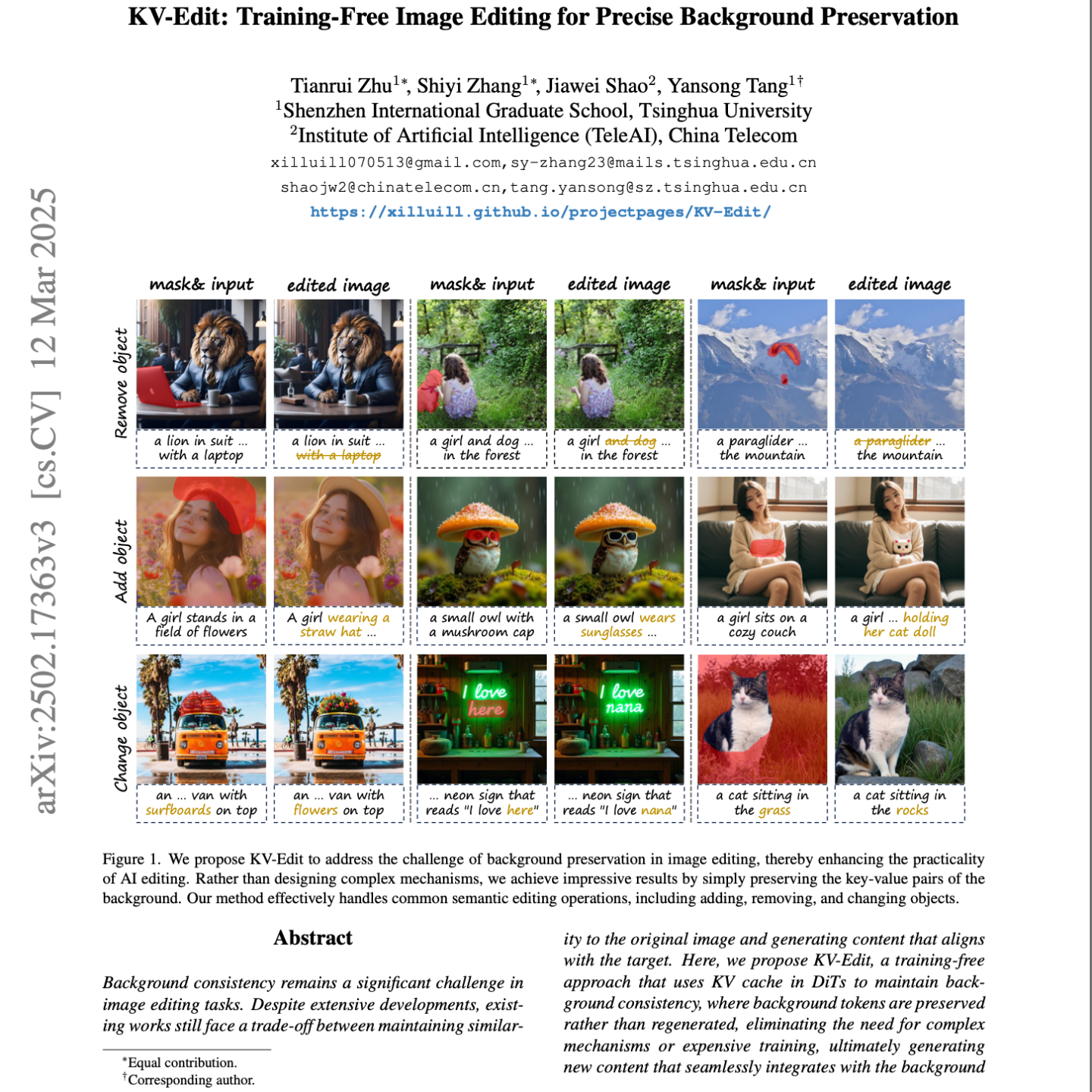 这篇研究文章提出了名为KV-Edit的新方法,旨在通过精确保留背景信息来改进图像编辑。该方法利用Vision Transformer (DiT)架构中的键值(KV)缓存机制,在编辑过程中保存背景区域的键值对,从而避免了传统方法中背景的一致性问题。通过解耦前景和背景,KV-Edit可以在不进行额外训练的情况下,有效地处理对象添加、删除和修改等多种编辑任务,同时保持编辑区域与原始背景的无缝集成。文章还探讨了内存优化和增强策略,以进一步提升该方法的实用性,并在定性和定量评估中展示了其在背景保持和图像质量方面的卓越性能。