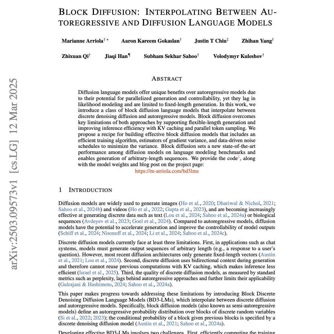 这些来源介绍了一种名为块扩散语言模型(BD3-LMs)的新型人工智能模型,它结合了自回归模型和扩散模型的优点。传统扩散模型在生成任意长度文本和推理效率方面存在局限性,而自回归模型则受限于顺序生成。BD3-LMs通过将文本分成块并在每个块内使用扩散模型进行并行生成来解决这些问题,同时利用键值缓存提高效率。研究表明,与现有扩散模型相比,BD3-LMs在语言建模基准测试中达到了最先进的性能,并且能够生成更长、质量更高的序列,部分得益于优化的训练算法和低方差的噪声调度。