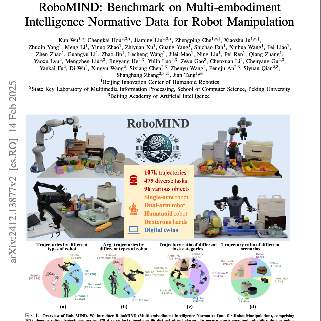名为RoboMIND的来源文档介绍了一个用于机器人操作的大型、多主体、高质量数据集,旨在推动通用机器人模型的开发。该数据集包含107k条演示轨迹,涵盖479项不同任务和96种对象类别,并利用人类遥操作以标准化方式收集数据,确保一致性和可靠性。RoboMIND不仅包括成功的操作轨迹,还收录了5k条现实世界中的失败案例及其详细原因,以及一个数字孪生模拟环境以促进低成本数据收集和评估。通过对各种模仿学习方法和视觉-语言-动作(VLA)模型进行广泛实验,RoboMIND被证明能够显著提高机器人操作的成功率和泛化能力,使其成为机器人学习领域的重要基准和资源。