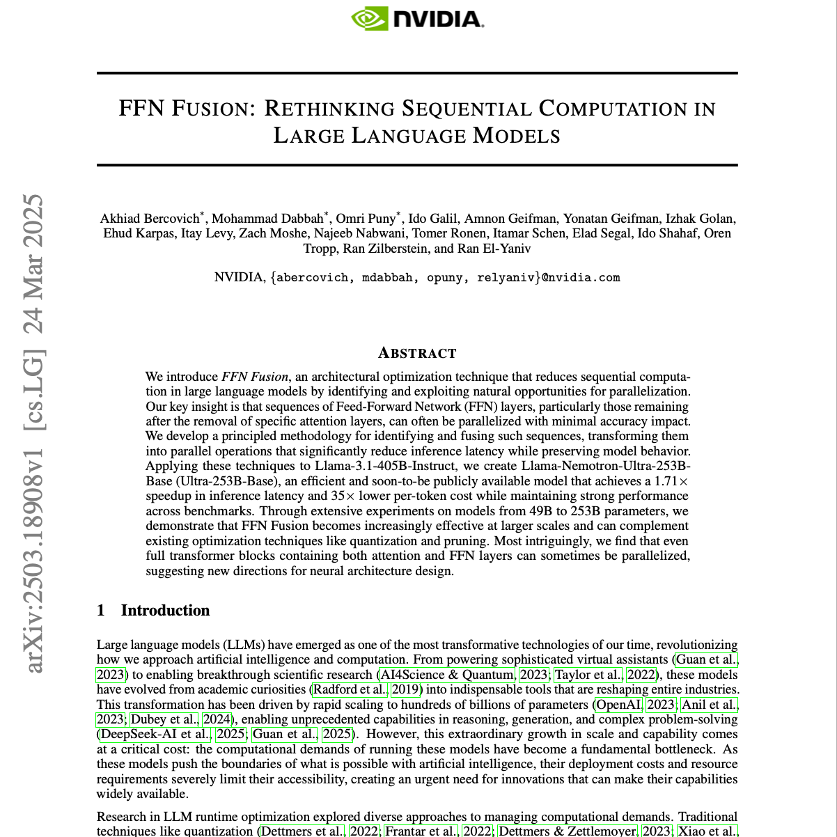 该论文介绍了一种名为FFN Fusion的新型优化技术,旨在提高大型语言模型的推理效率。通过识别并整合变压器架构中连续的馈送网络(FFN)层,该方法将顺序计算转化为并行操作,从而显著减少推理延迟和每令牌成本。研究人员利用这种技术开发了Ultra-253B-Base模型,该模型在保持或超越原始大型模型性能的同时,实现了显著的速度提升和更低的内存占用。此外,该研究还探讨了不同模型层之间的依赖关系,为未来的模型架构设计和优化方向提供了新的见解,甚至表明整个变压器块也能在某些情况下并行化。