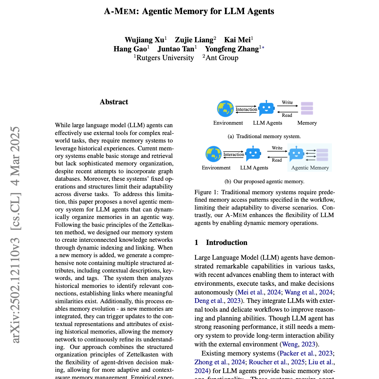 此文档介绍了一种名为 A-MEM 的新型代理式记忆系统,旨在提升大型语言模型(LLM)代理处理复杂现实任务的能力。该系统通过借鉴 Zettelkasten 方法,能够动态组织和演化记忆,从而克服了现有记忆系统固定操作和结构所带来的局限性。A-MEM 能够自主生成上下文描述、建立记忆间的关联,并根据新经验更新现有记忆,从而在长期对话任务中展现出卓越的性能,尤其是在需要复杂推理的多跳任务中。该研究还通过 消融研究 和 超参数分析 验证了其关键模块的有效性,并提供了 记忆嵌入的可视化 以展示其优化的结构。