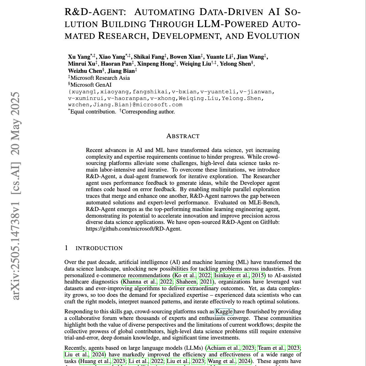 这篇技术报告介绍了 R&D-Agent,这是一个用于自动化数据驱动型人工智能解决方案构建的双代理框架。该系统旨在通过 研究员代理 生成创意并分析反馈,以及 开发人员代理 基于错误日志完善代码,来应对数据科学中日益增长的复杂性和专业知识需求。R&D-Agent 的独特之处在于其支持多个 平行探索路径,这些路径可以相互融合和增强,从而显著提高效率和解决方案的质量。在 MLE-Bench 上的评估显示,该框架在机器学习工程任务中超越了现有基线,特别是在不同复杂程度的挑战中表现出色,这表明它有潜力缩小自动化解决方案与专家级性能之间的差距。