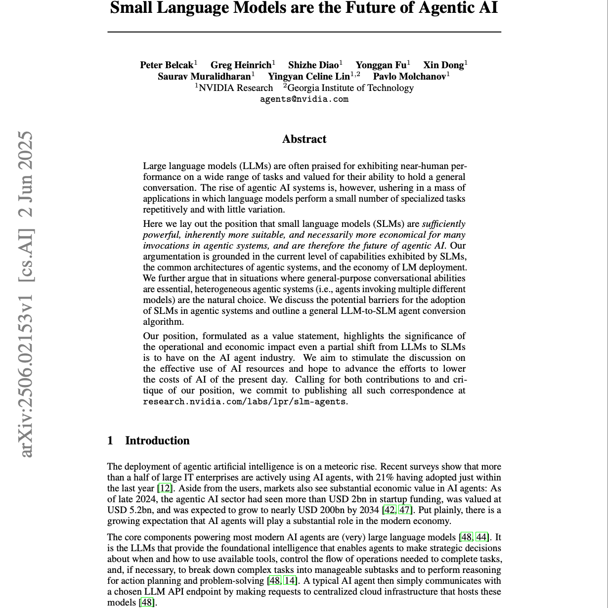 该论文提出并论证了小型语言模型(SLM)是代理AI未来的核心。文章强调,尽管大型语言模型(LLM)因其通用能力而受到推崇,但在代理系统中,许多任务是重复、专业且非对话性的,这使得SLM成为更经济、更灵活且功能足够强大的选择。作者认为,SLM的采用将带来显著的运营和经济效益,甚至在需要通用对话能力的场景中,也可以通过结合SLM和LLM的异构系统来实现最佳效果。为了促进SLM的普及,文中还讨论了当前面临的障碍,并提出了一个将LLM驱动的代理转换为SLM驱动代理的算法。最终,该研究呼吁就如何有效利用AI资源和降低成本进行更广泛的讨论。