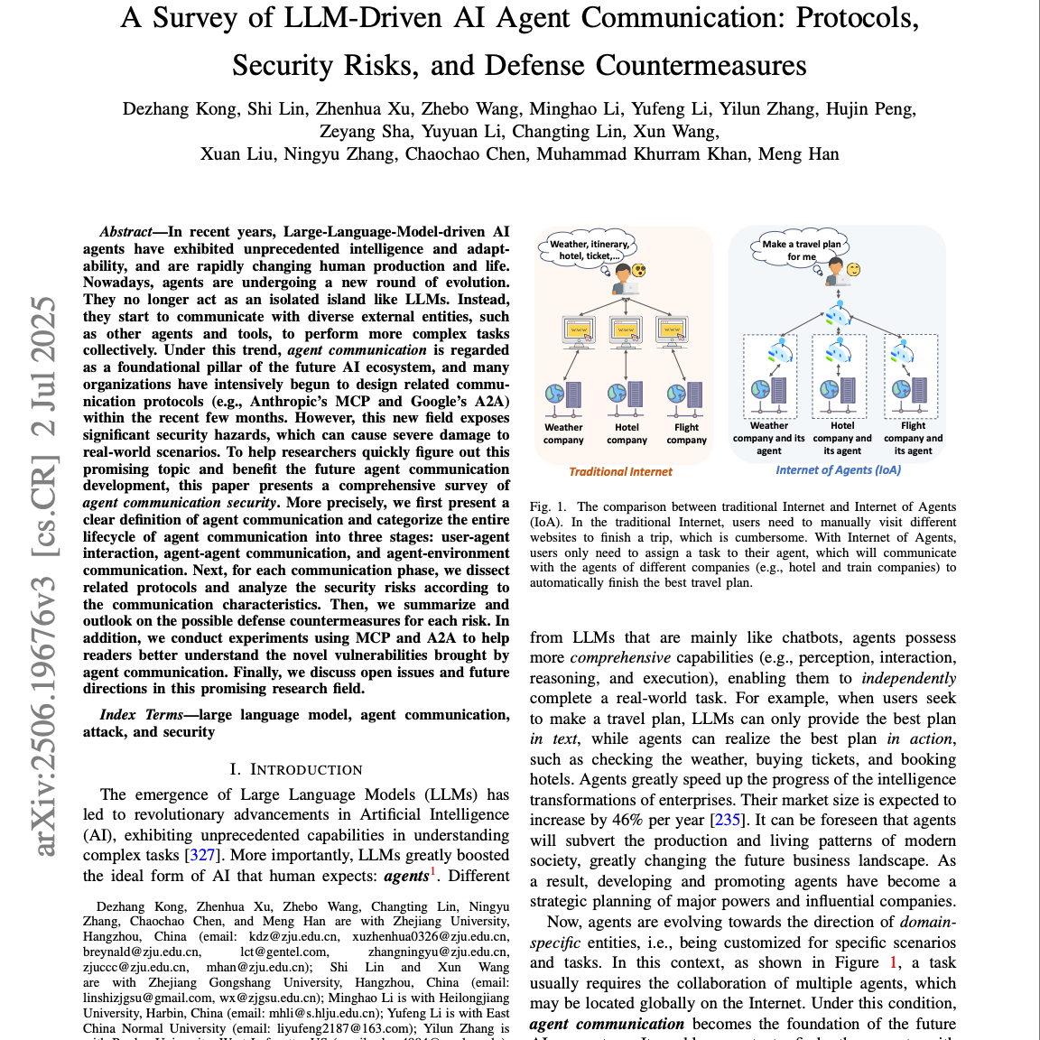 这篇研究文章全面概述了大型语言模型驱动的AI代理通信及其相关安全挑战。文章首先明确定义了代理通信,并将其划分为用户-代理、代理-代理和代理-环境三个关键阶段,详细探讨了各阶段的协议、潜在风险和防御策略。通过对Anthropic的MCP和Google的A2A等流行协议进行实验性案例研究,作者们揭示了新出现的攻击面,例如恶意代码执行、检索欺骗和工具投毒。最后,文章还讨论了该领域的开放性问题,并提出了技术和法律层面的未来发展方向,以确保AI生态系统的安全和可靠。