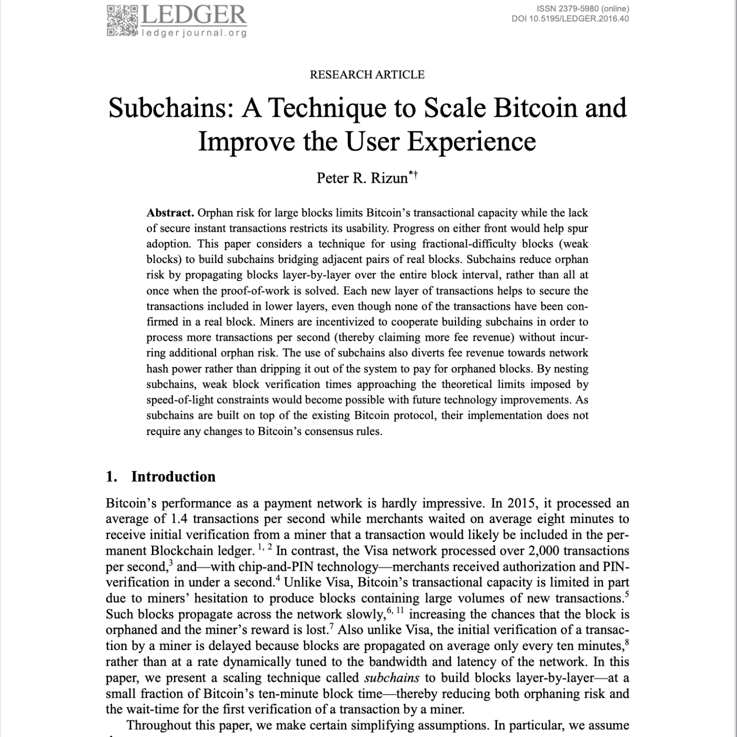 该研究论文提出了“子链”技术,旨在扩展比特币并改善用户体验,同时不改变其共识规则。子链通过使用分数难度区块(弱区块)在相邻的真实区块之间建立桥梁,从而逐层传播区块,显著降低大区块的孤块风险并加快交易的初始验证时间。作者认为,这种机制能激励矿工合作以处理更多交易并收取更多费用,同时证明了它能增强未确认交易的安全性并维持交易费市场。文章还探讨了嵌套子链作为进一步提高可扩展性的方案,并对比了其他扩展性提议。