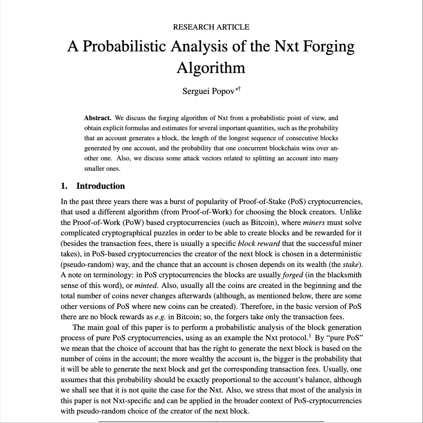 该研究论文对 Nxt 加密货币中使用的 纯权益证明 (PoS) 区块生成算法进行了深入的概率分析。 文章比较了两种区块选择机制——“U-算法”(Nxt 当前使用)和理论上更公平的 “Exp-算法”——评估它们如何影响账户生成区块的概率。 此外,作者探讨了几种潜在的攻击策略,包括账户拆分的影响、某一方连续生成区块的能力,以及攻击者试图伪造“更好”的并发区块链的尝试。 总体而言,该分析表明,尽管 PoS 方案在数学上很有趣且具有潜力,但它提出了新的攻击载体,尤其是在财富高度集中的情况下,其中拥有超过 50% 权益的实体可能能够 永久锻造 所有区块。
