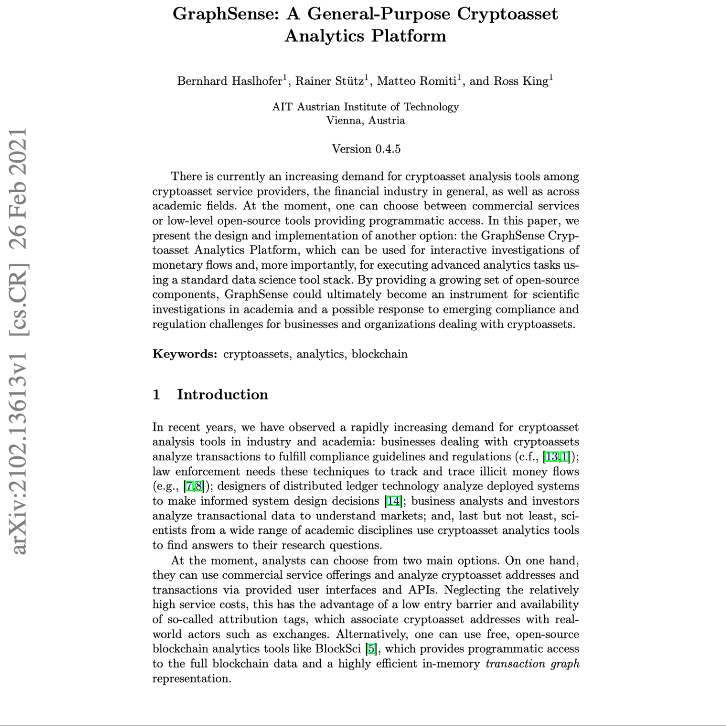 该文件介绍了 GraphSense,这是一个通用的 加密资产分析平台,旨在满足加密资产服务提供商、金融业和学术界日益增长的分析需求。该平台提供了一种不同于现有商业服务或低级开源工具的 第三种选择,通过提供开源组件,使交互式货币流调查和高级分析任务的执行成为可能。GraphSense 的关键设计特性包括 数据主权、预先计算图抽象(地址图和实体图)以及 协作式地址标记(TagPacks)。该平台基于标准的 数据科学技术栈,包括 Apache Cassandra 和 Apache Spark,并提供 REST API 和可视化仪表板等访问接口,以支持 学术研究 和应对新兴的 合规和监管挑战。