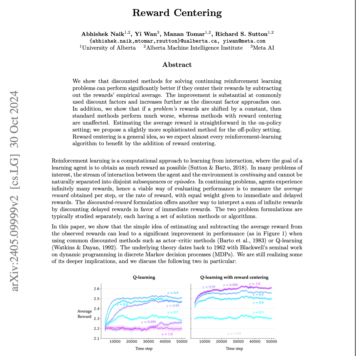 This research paper investigates the effectiveness of reward centering, a technique that involves subtracting the average reward from observed rewards in reinforcement learning problems. The authors demonstrate that this simple method can significantly improve the performance of standard reinforcement learning algorithms, particularly when using discounted rewards and as the discount factor approaches one. They explain the underlying theory behind this improvement, showing how centering removes a state-independent constant term from value estimates, enabling the algorithm to focus on the relative differences between states and actions. The paper also examines the application of reward centering in both on-policy and off-policy settings, proposing a more sophisticated method for the off-policy case, and provides a case study using Q-learning with various function approximation methods. The authors conclude that reward centering is a general technique that can enhance data efficiency and robustness in various reinforcement learning algorithms, offering potential for future algorithms that adapt their discount rate over time.
