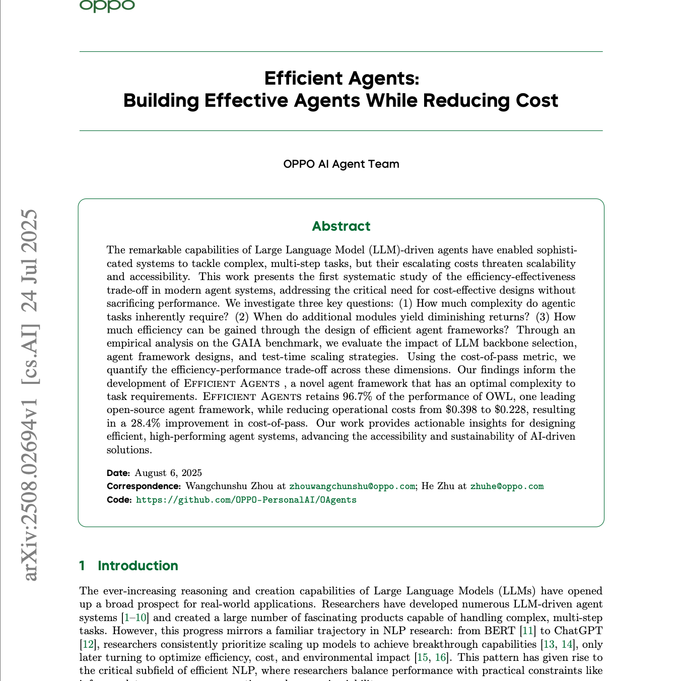 该研究系统地分析了 大型语言模型(LLM)驱动的智能体系统 中存在的 效率与性能的权衡 问题,指出尽管LLM智能体的能力显著增强,但其不断攀升的成本严重威胁了其可扩展性和可及性。通过在GAIA基准上进行实证分析,研究人员评估了 LLM骨干模型选择、规划、工具使用和内存机制 等核心组件对效率和性能的影响,并采用了 “通过成本”(cost-of-pass) 这一指标来量化经济效益。基于这些发现,作者提出了 “高效智能体”(Efficient Agents) 框架,该框架通过优化组件配置,在保持96.7%性能的同时,将运营成本降低了28.4%,为构建更具 成本效益 的高性能AI解决方案提供了实用见解。