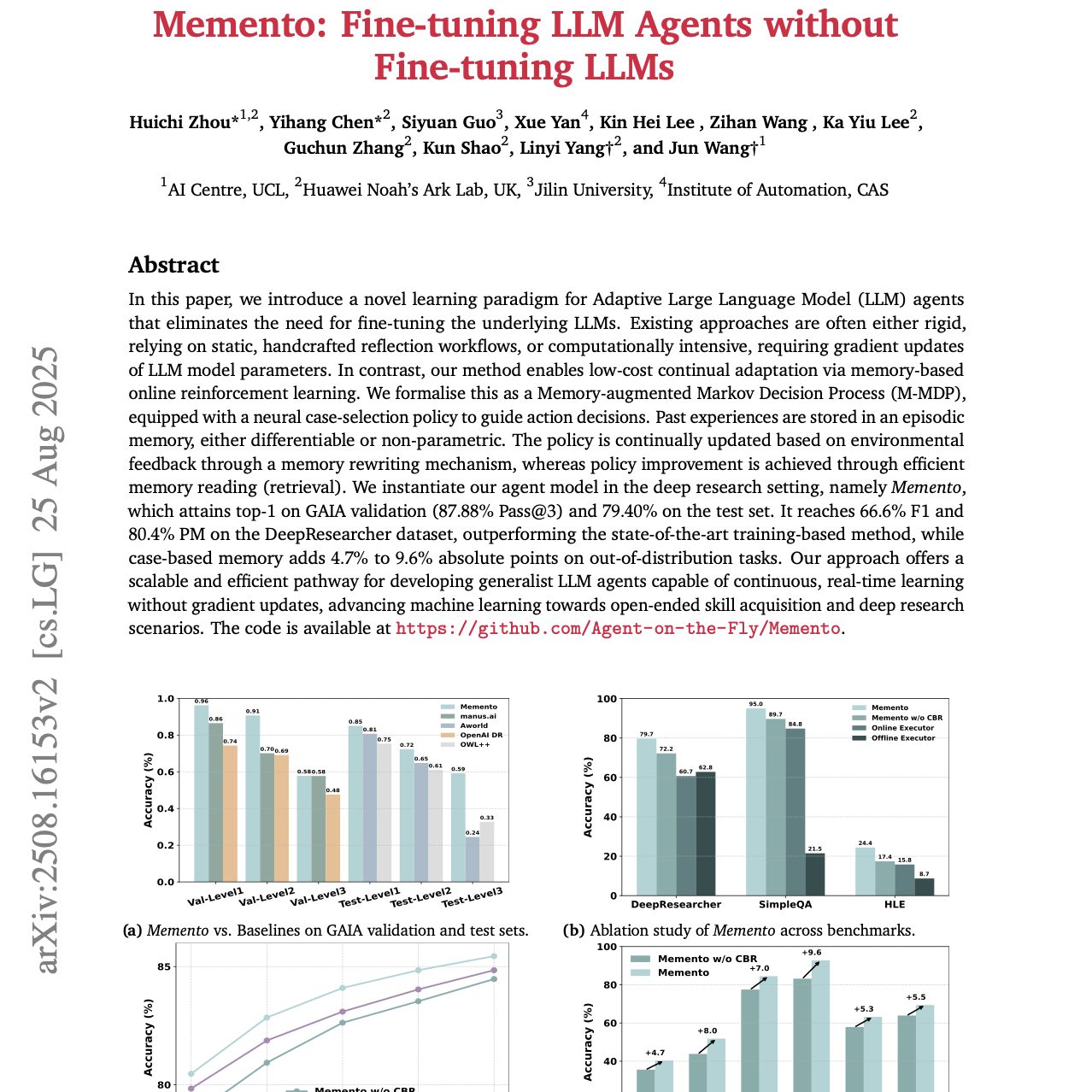 本文提出了一种用于自适应大型语言模型(LLM)智能体的全新学习范式,该范式无需对底层 LLM 进行微调。现有方法往往存在两类局限:要么依赖静态、人工设计的反思工作流,灵活性不足;要么计算成本高昂,需要对 LLM 模型参数进行梯度更新。相比之下,我们的方法通过基于记忆的在线强化学习,实现了低成本的持续自适应。