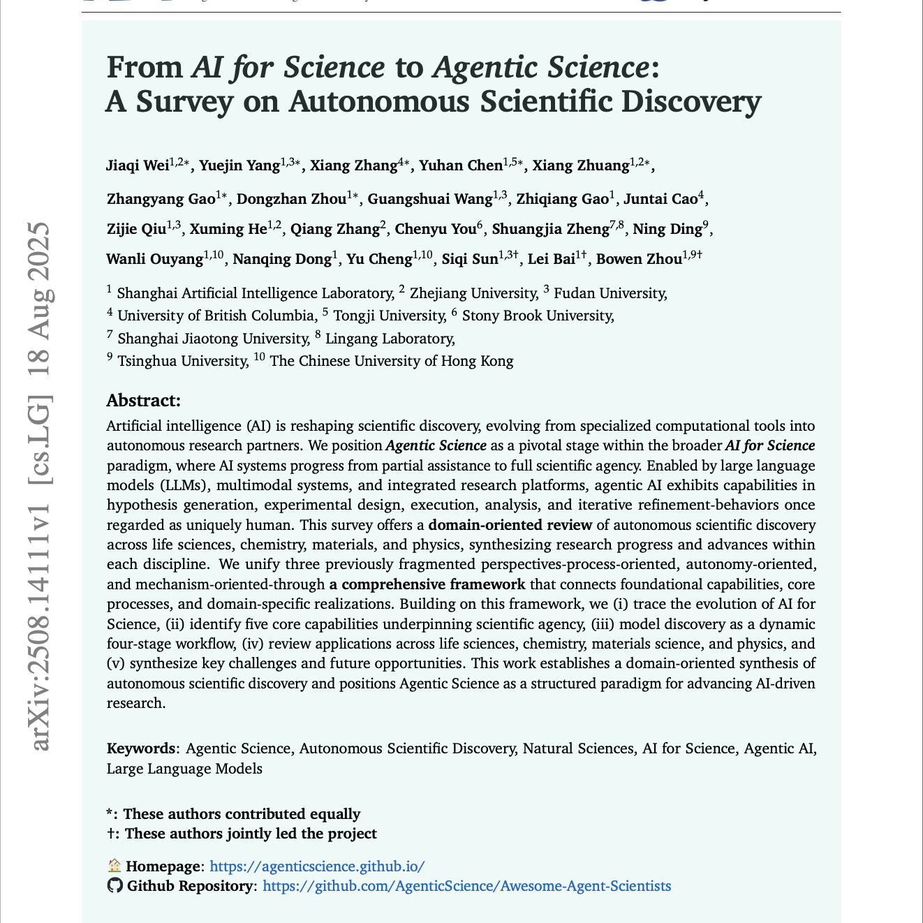 人工智能(AI)正在重塑科学发现的方式,其角色正从专用的计算工具演进为自主的科研合作伙伴。我们将 Agentic Science(具身智能科学/代理型科学) 定位为“科学中的人工智能(AI for Science)”这一更大范式中的关键发展阶段,在这一阶段,AI 系统从部分辅助逐步走向具备完整科学主体性的自主体。得益于大语言模型(LLMs)、多模态系统以及集成化科研平台,代理型 AI 已展现出在假设生成、实验设计、实验执行、结果分析以及迭代优化等方面的能力——这些行为过去被普遍认为是人类科学家的独有特征。