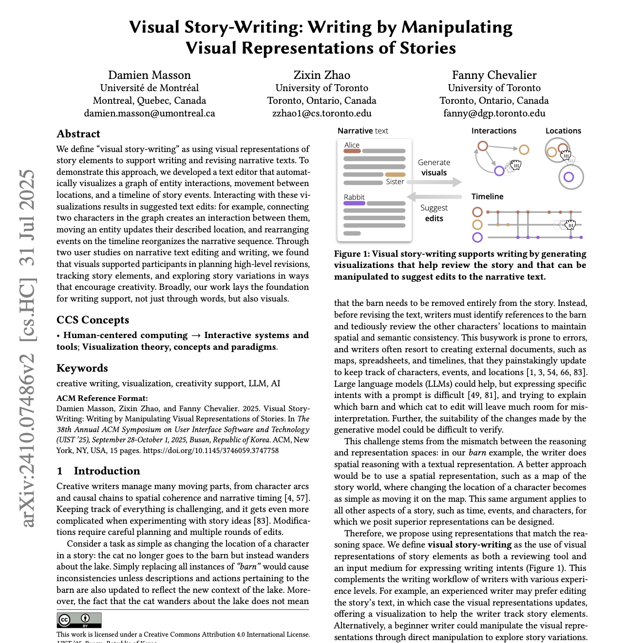与这些可视化内容进行交互会产生相应的文本编辑建议:例如,在图中连接两个角色会在文本中生成他们之间的一次互动;移动某个实体会更新其所描述的位置;重新排列时间线上的事件则会重组叙事的顺序。