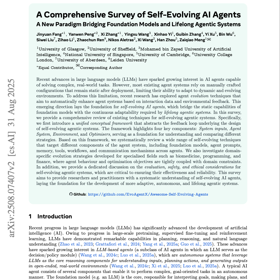 大型语言模型的最新进展引发了人们对能够解决复杂现实任务的 AI 智能体的广泛兴趣。然而,大多数现有的智能体系统依赖于人工设计的配置,这些配置在部署后保持静态,限制了其在动态和不断演化的环境中进行适应的能力。为此,近期研究探索了智能体进化技术,旨在基于交互数据和环境反馈自动增强智能体系统。这一新兴方向为自进化 AI 智能体奠定了基础,它将基础模型的静态能力与终身智能体系统所需的持续适应能力结合起来。