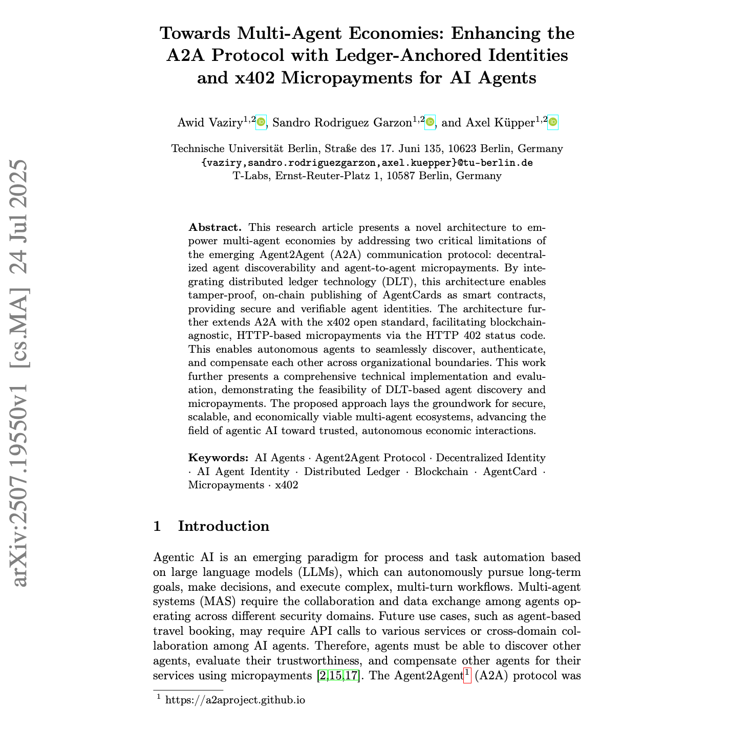 本研究同时给出了全面的技术实现与评估,验证了基于 DLT 的代理发现与小额支付机制的可行性。所提出的方法为安全、可扩展且具有经济可行性的多代理生态系统奠定基础,推动代理型人工智能在可信的自治经济交互方向持续发展。