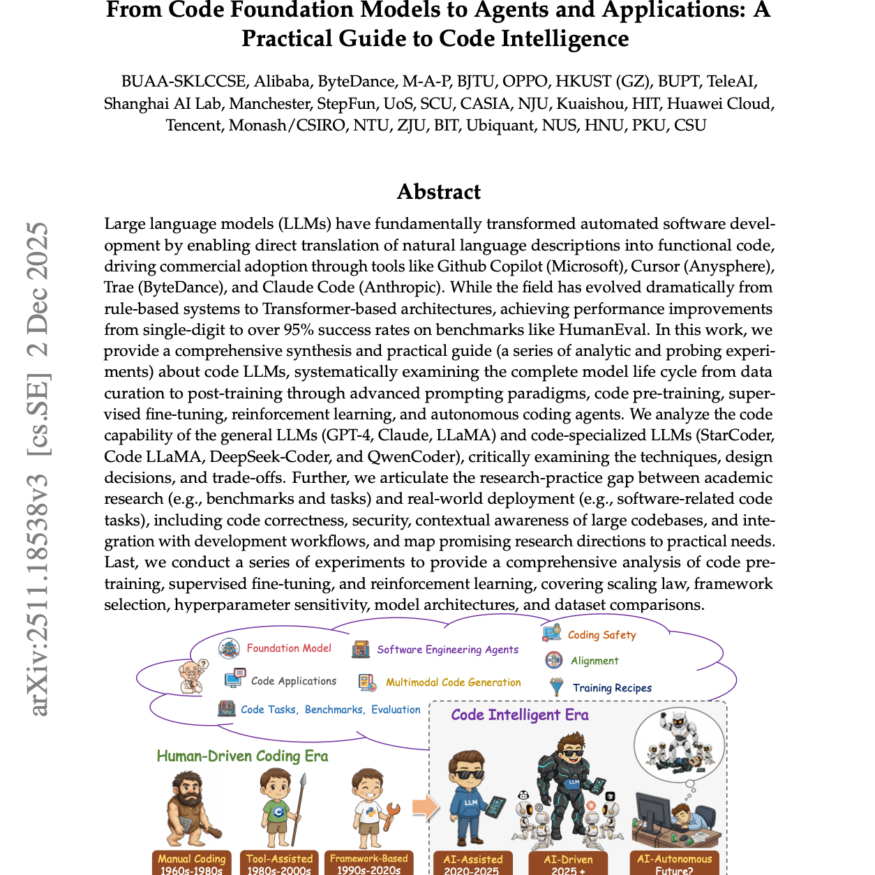 在本研究中,我们对代码 LLM 进行系统性的综述与实践指南(涵盖一系列分析性与探测性实验),全面考察从数据筛选、预训练到后训练阶段的完整模型生命周期,包括高级提示范式、代码预训练、监督微调、强化学习以及自主编程代理。我们分析了通用 LLM(GPT-4、Claude、LLaMA)与代码专用 LLM(StarCoder、Code LLaMA、DeepSeek-Coder、QwenCoder)的代码能力,并对其技术、设计选择与权衡进行了批判性审视。