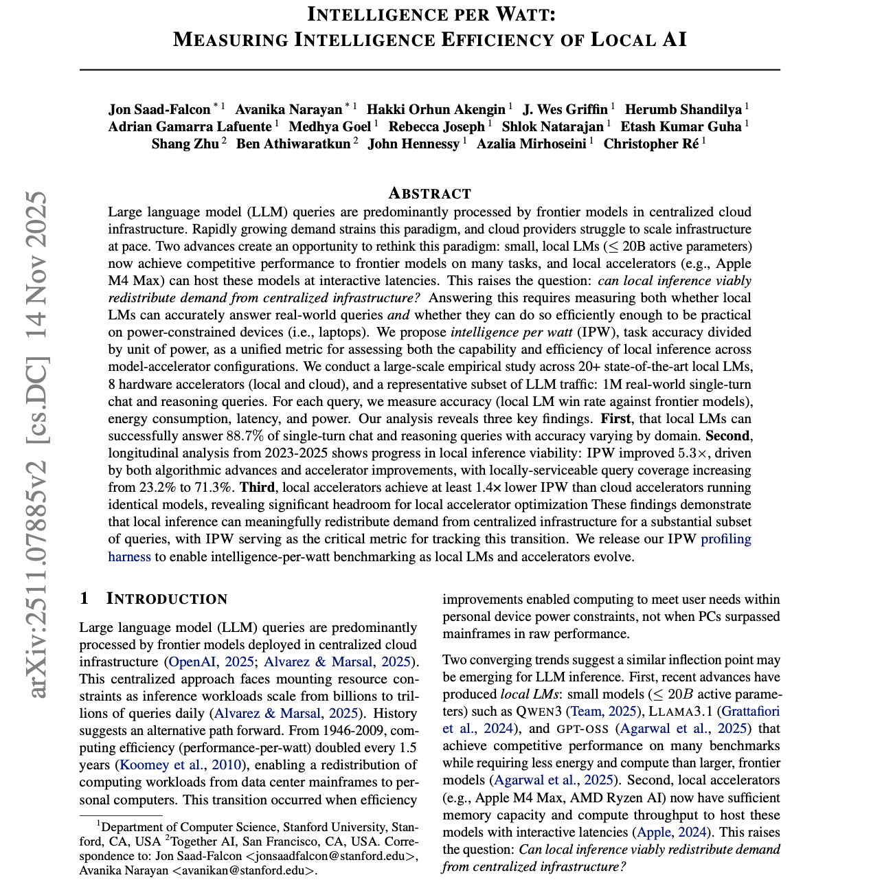 我们提出“每瓦智能”(Intelligence Per Watt,IPW)这一指标,即任务准确率除以单位功耗,用于评估不同模型–加速器组合下本地推理的能力与效率。我们开展了一项大规模实证研究,覆盖 20 余个最先进的本地语言模型、8 种加速器,以及一组具有代表性的 LLM 流量:100 万条真实世界的单轮聊天与推理查询。对于每一条查询,我们测量其准确率、能耗、延迟和功率。