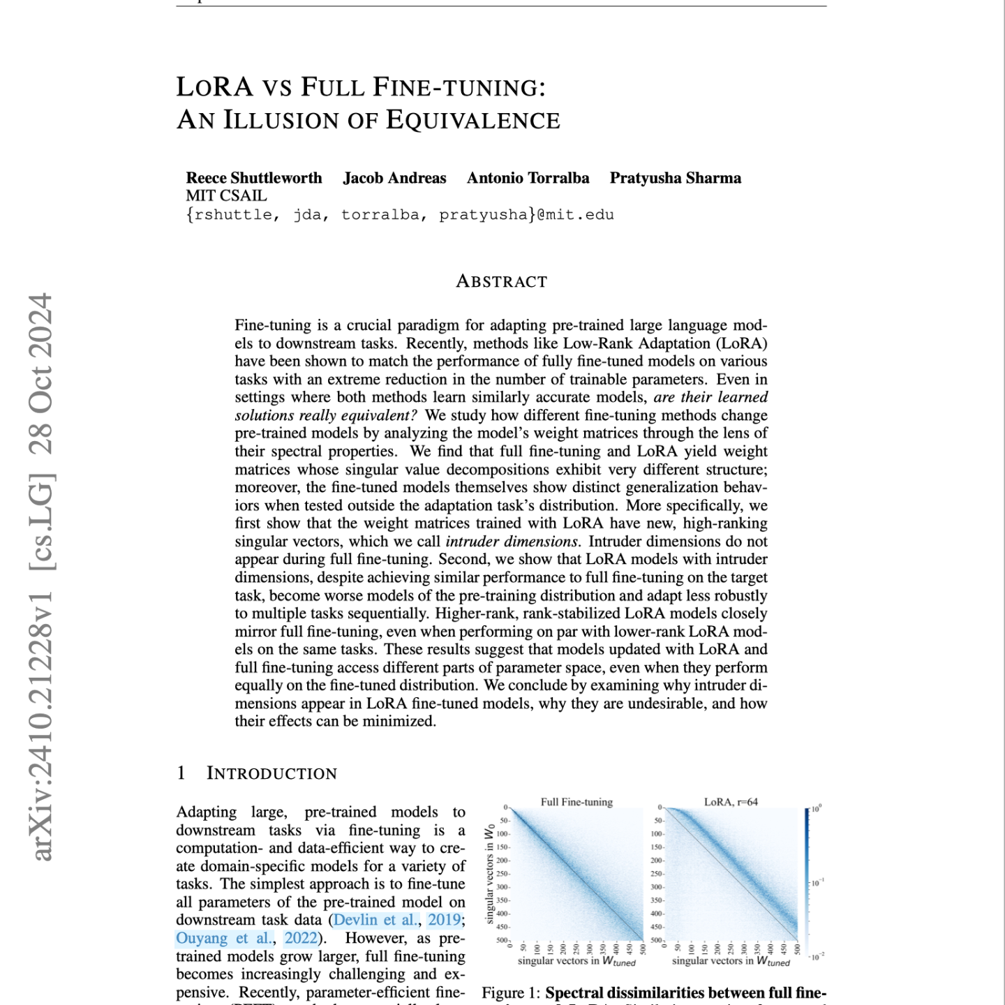 This research paper investigates the differences between two popular methods for fine-tuning large language models: full fine-tuning and Low-Rank Adaptation (LoRA). While both approaches can achieve comparable performance on downstream tasks, the authors show that these methods learn fundamentally different solutions. They analyze the spectral properties of weight matrices to identify "intruder dimensions" - singular vectors that appear in LoRA models but not in fully fine-tuned models. These intruder dimensions contribute to a phenomenon where LoRA models exhibit less robust generalization than full fine-tuning, especially when trained on multiple tasks sequentially. The authors further explore how the design choices in LoRA, such as rank and the scaling factor α, affect the emergence of intruder dimensions and the overall performance of the models. They conclude that although LoRA can achieve comparable performance to full fine-tuning on specific tasks, it might not be the optimal choice for scenarios requiring robust generalization and continual learning.