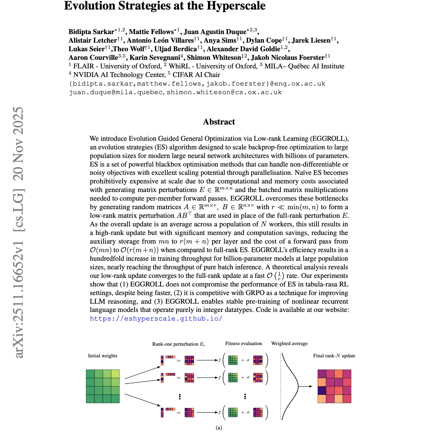 我们提出 EGGROLL(Evolution Guided General Optimization via Low-rank Learning,基于低秩学习的进化引导通用优化),一种进化策略(Evolution Strategies,ES)算法,旨在将无需反向传播的优化方法扩展到适用于拥有数十亿参数的现代大型神经网络架构和超大规模种群规模。ES 是一类强大的黑盒优化方法,能够有效处理不可微或含噪目标函数,并可通过并行化实现良好的扩展性。