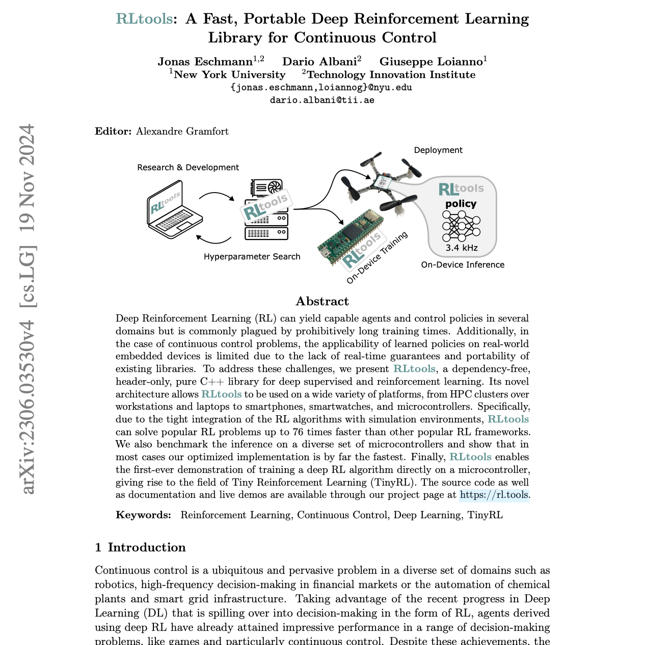 RLtools, a new open-source C++ library, significantly accelerates deep reinforcement learning (RL) for continuous control problems. Its header-only, dependency-free design enables fast training and inference across diverse platforms, from high-performance computers to microcontrollers. This speed improvement is demonstrated through benchmarks showing substantial performance gains over existing RL frameworks. A key contribution is the first-ever demonstration of training a deep RL algorithm directly on a microcontroller, opening the field of "TinyRL." The library's architecture, based on C++ templating and a novel static multiple-dispatch paradigm, is central to its speed and portability.