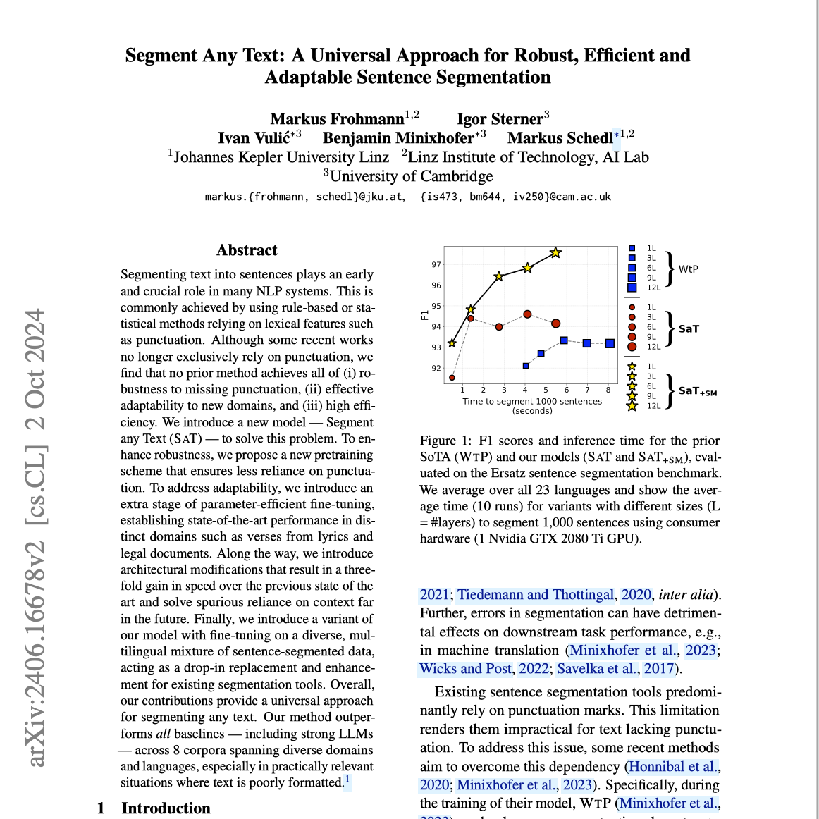 这篇研究论文介绍了一种名为 Segment Any Text(SAT)的新型句子分割模型,其性能超越了现有方法。SAT 通过在训练过程中减少对标点符号的依赖,实现了更强的鲁棒性;通过参数高效的微调适应不同领域(如歌词、法律文本),展现了优异的适应性;并以高效性为特点,在性能上甚至超过了强大的大型语言模型(LLMs)。作者详细描述了 SAT 的架构、训练过程以及在多种语言和语料库上的广泛评估,尤其是在处理格式较差的文本时表现出色。最后,论文讨论了该方法的伦理考量和局限性。