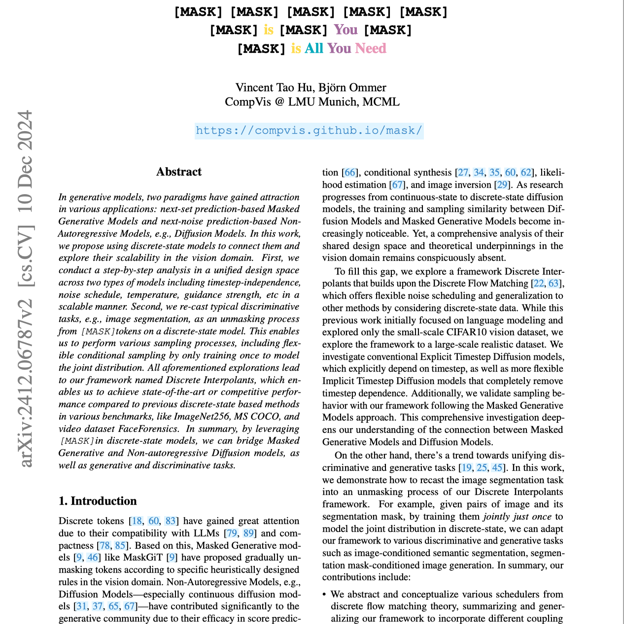 这篇研究论文介绍了 离散插值(Discrete Interpolants)框架,这是一种将掩码生成模型(Masked Generative Models)和扩散模型(Diffusion Models)结合用于图像和视频生成的新框架。该框架使用离散状态模型,并提供了统一的设计空间分析,探索了各种调度器和采样方法。作者通过将图像分割重新构造为去掩码过程,展示了其多功能性,并在多个基准测试中取得了最先进的成果。此外,研究还探讨了从显式时间步模型到隐式时间步模型的过渡,提升了效率,并使这两种模型范式之间的联系更加紧密。