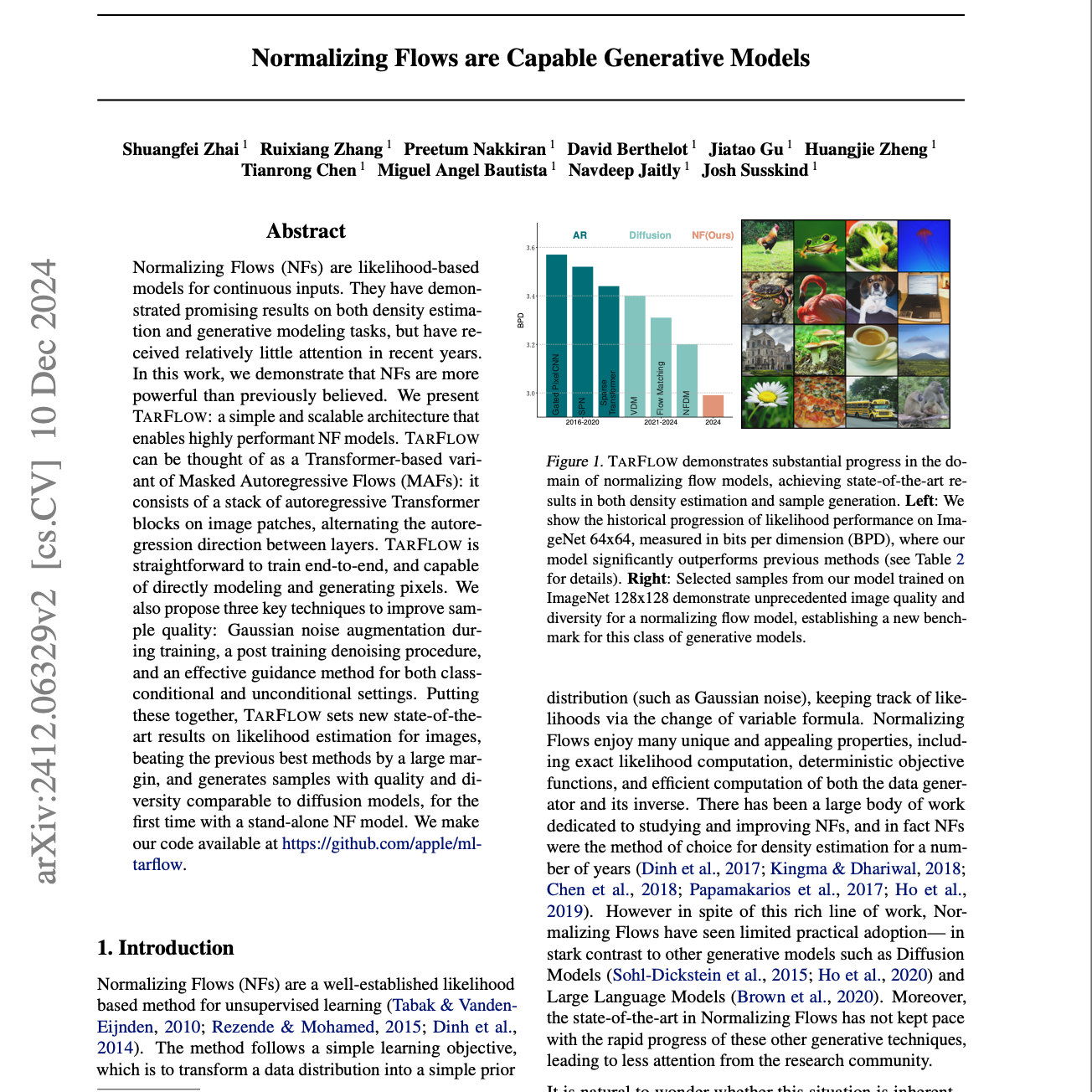 这篇研究论文介绍了 TARFLOW,一种基于 Transformer 的正则化流(Normalizing Flow, NF)架构,用于图像的生成建模。TARFLOW 在前述 NF 模型的基础上取得了显著的改进,在似然估计方面达到了最先进的结果,并生成了与扩散模型相媲美的高质量样本。关键进展包括:更具可扩展性的架构、训练过程中的高斯噪声增强、训练后去噪方法,以及一种用于条件生成和无条件生成的引导方法。作者在多个图像数据集上展示了 TARFLOW 的卓越表现,展现了其作为一种强大生成建模技术的潜力。相关代码已公开。