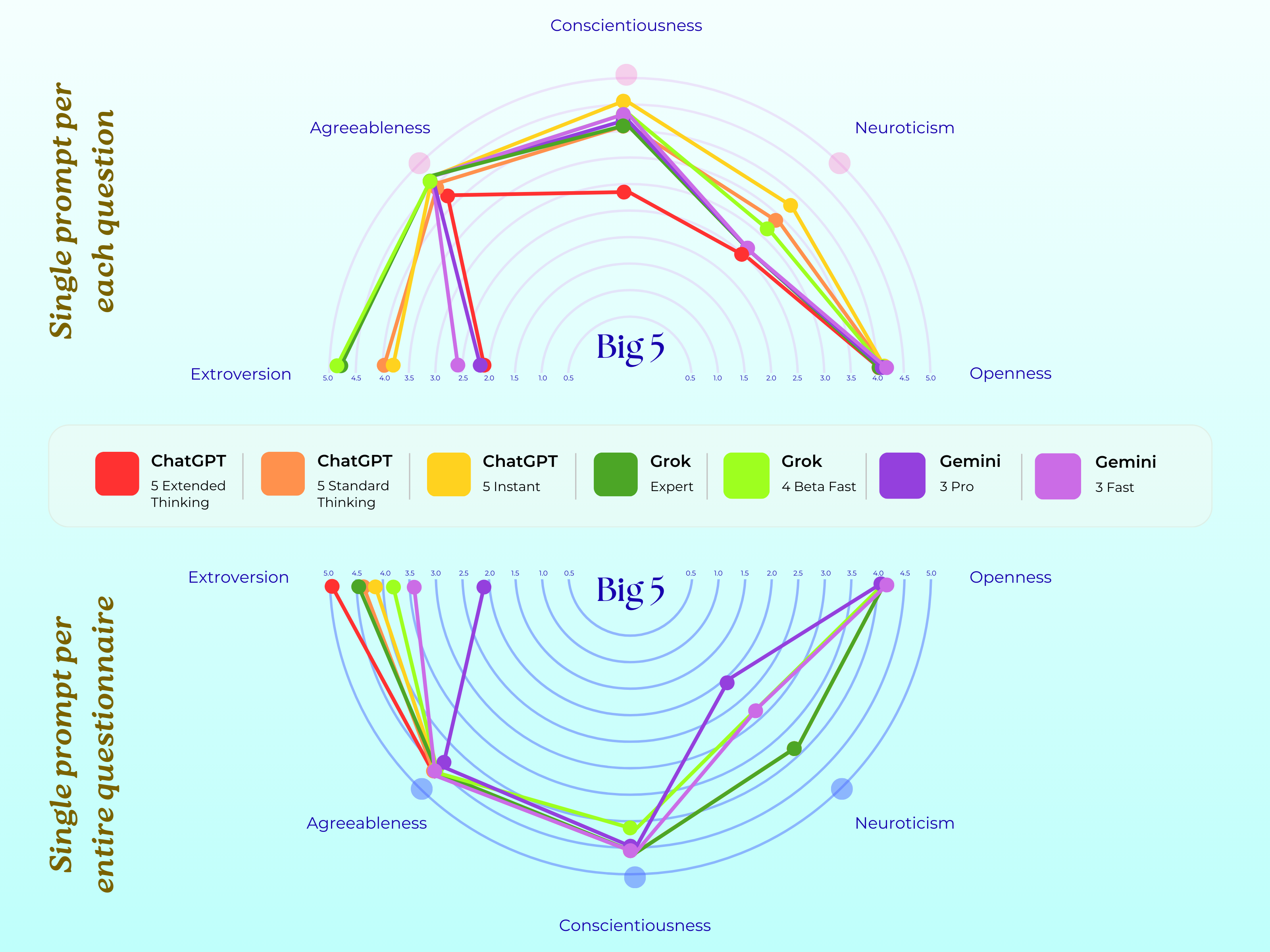 在两个不同的提示实验中,ChatGPT、Grok 和 Gemini 的 Big 5 测试结果