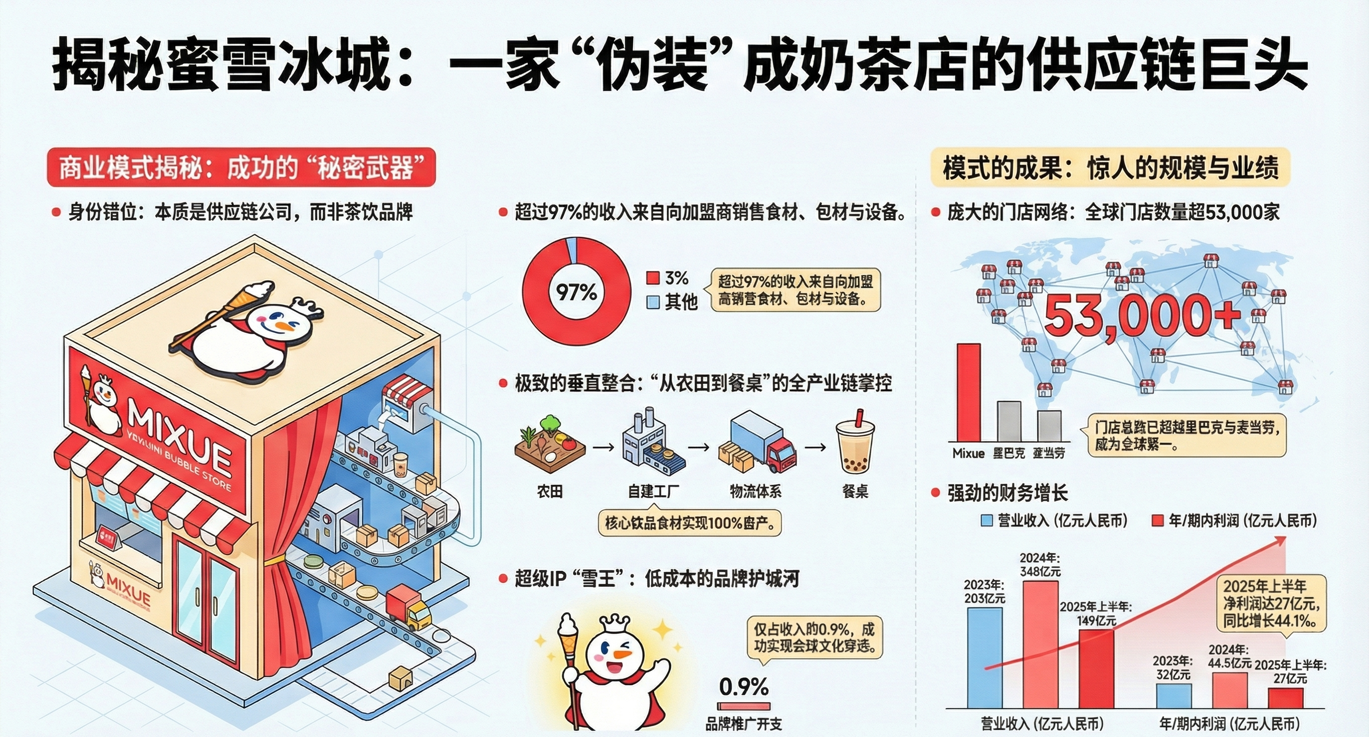 - 关键论点:蜜雪冰城并非传统意义上的奶茶公司,而是一家伪装成奶茶店的庞大、精密且垂直一体化的供应链公司。其收入的97%来自向加盟商销售原材料、包装材料和设备,而非直接销售饮品。