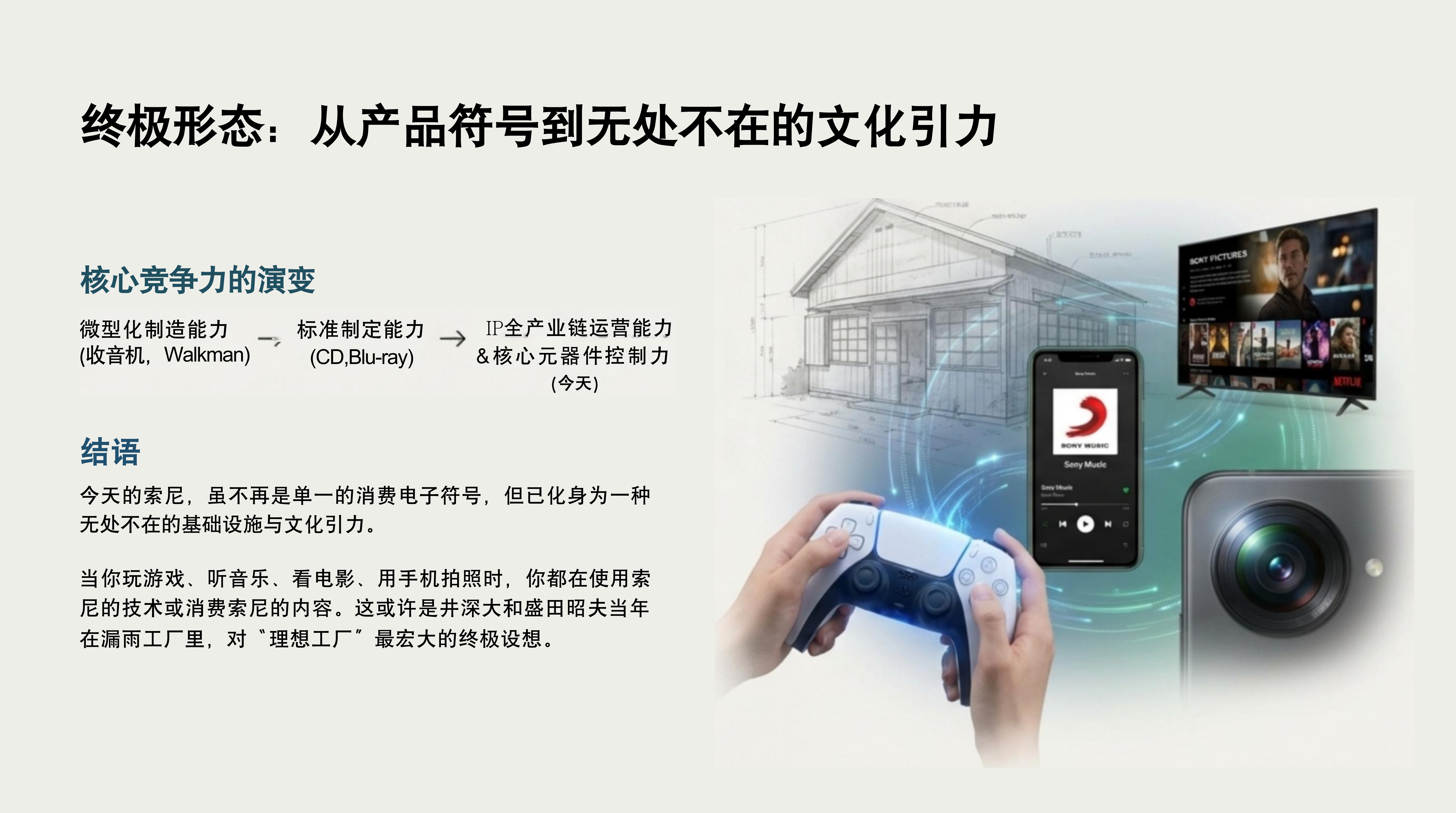 - 核心议题:探讨索尼如何从一家战后的小公司,历经80年发展,成为横跨游戏、音乐、电影等多个领域的创意娱乐巨头,并分析其商业模式和战略演变。