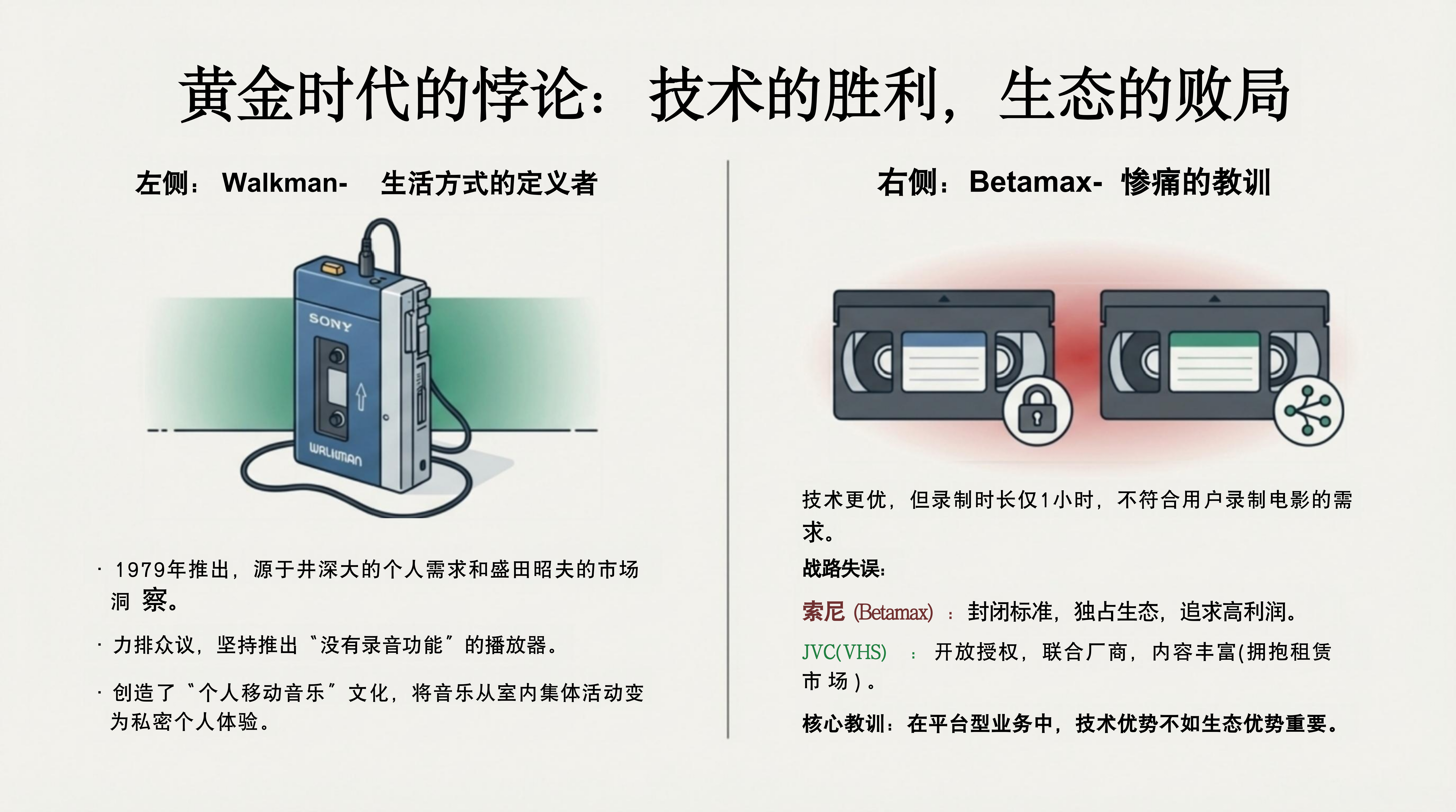 - 核心议题:索尼在录像带格式大战中因“技术至上”而失利。