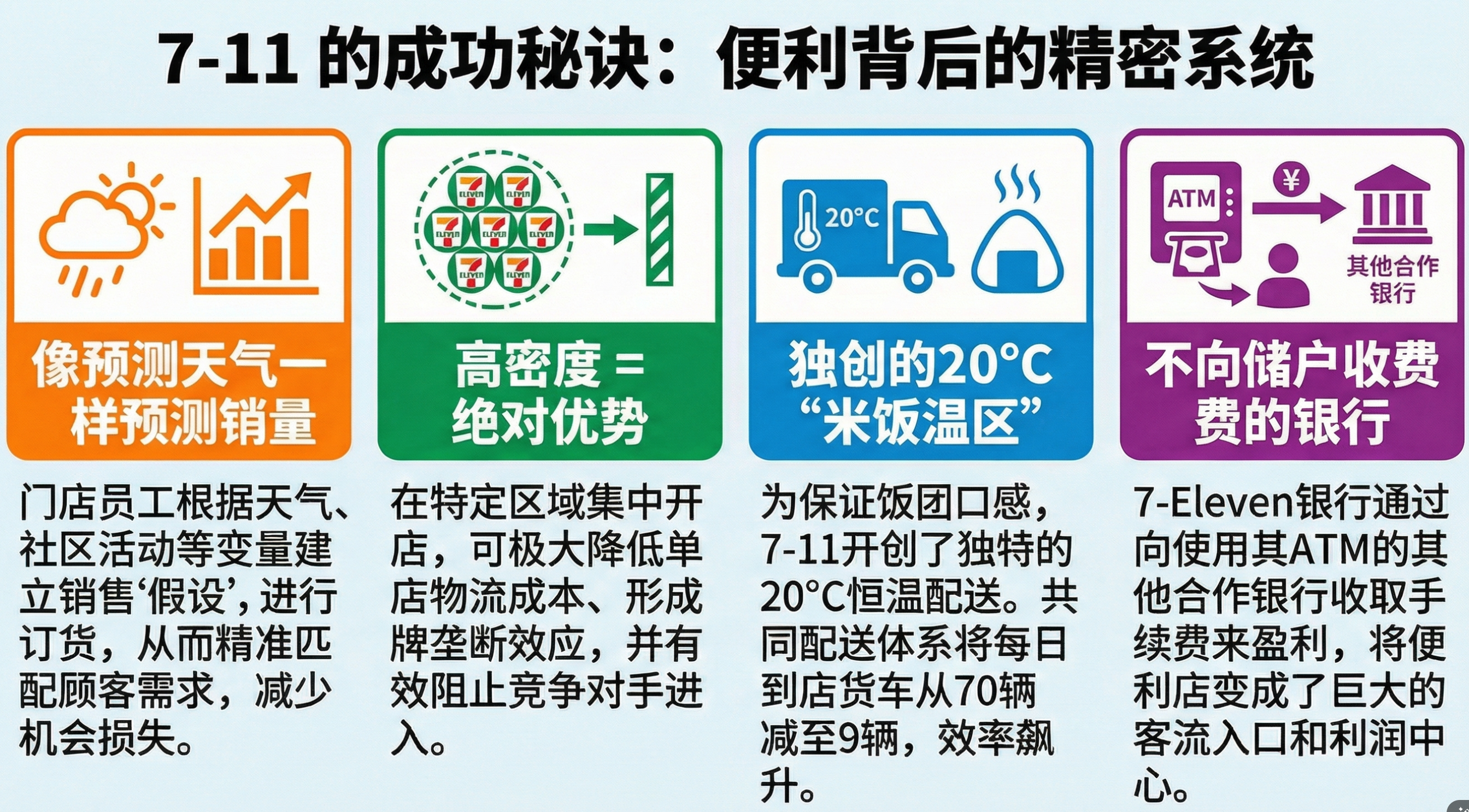 - 关键论点:为保证饭团口感,7-Eleven专门开发了20摄氏度的恒温物流体系,从生产到门店全程保持。在商品开发上,其自有品牌7-Premium追求质量高于知名品牌,价格更低,甚至为特定产品改造生产线,创造出具有目的性的商品。