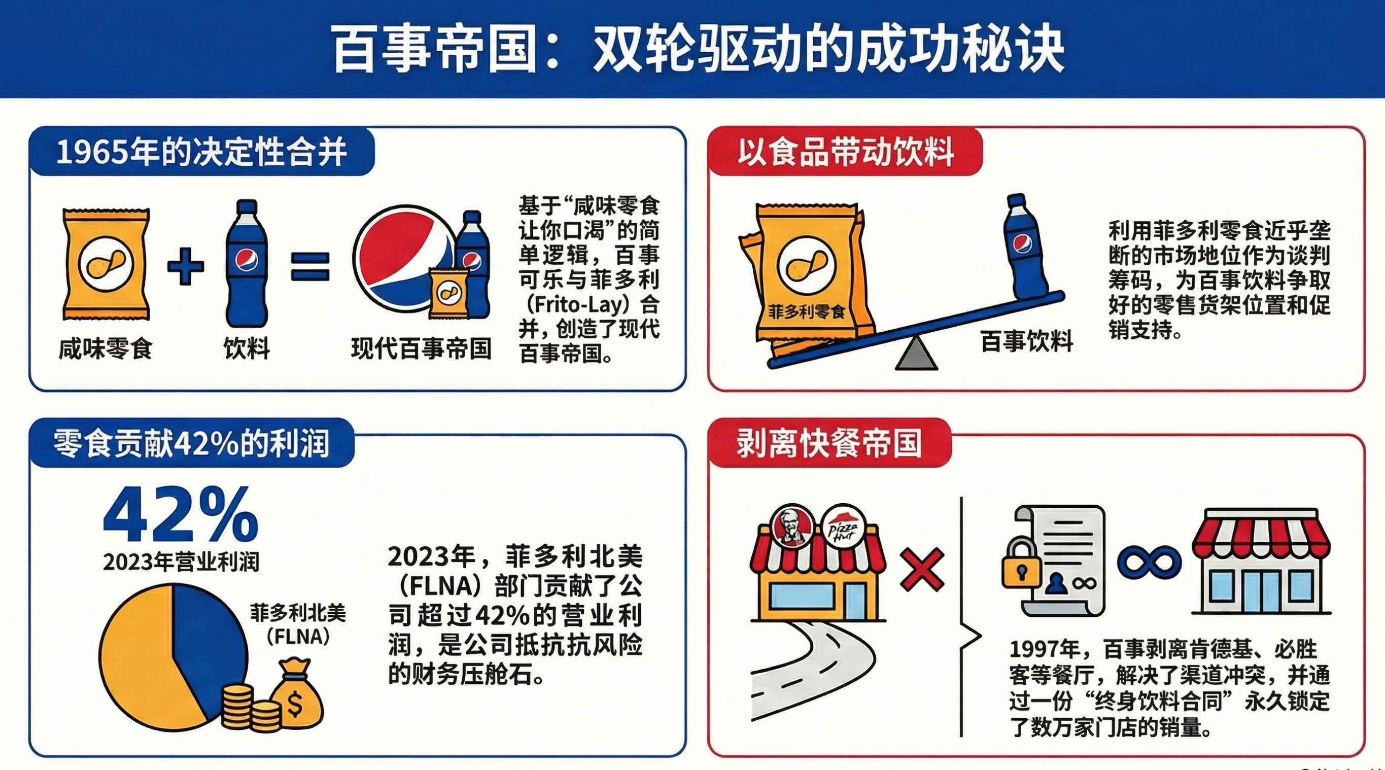 核心议题:百事可乐与飞多利(Frito-Lay)的合并,以及“Power of One”战略的实施。 关键论点:1965年,百事可乐与零食公司飞多利合并,创造了“零食+饮料”的协同模式。这一战略通过将零食和饮料捆绑销售,满足了消费者在同一场景下的双重需求,形成了独特的竞争优势,并为百事挖下了“护城河”。 06:06 进军快餐业的尝试与“金蝉脱壳”