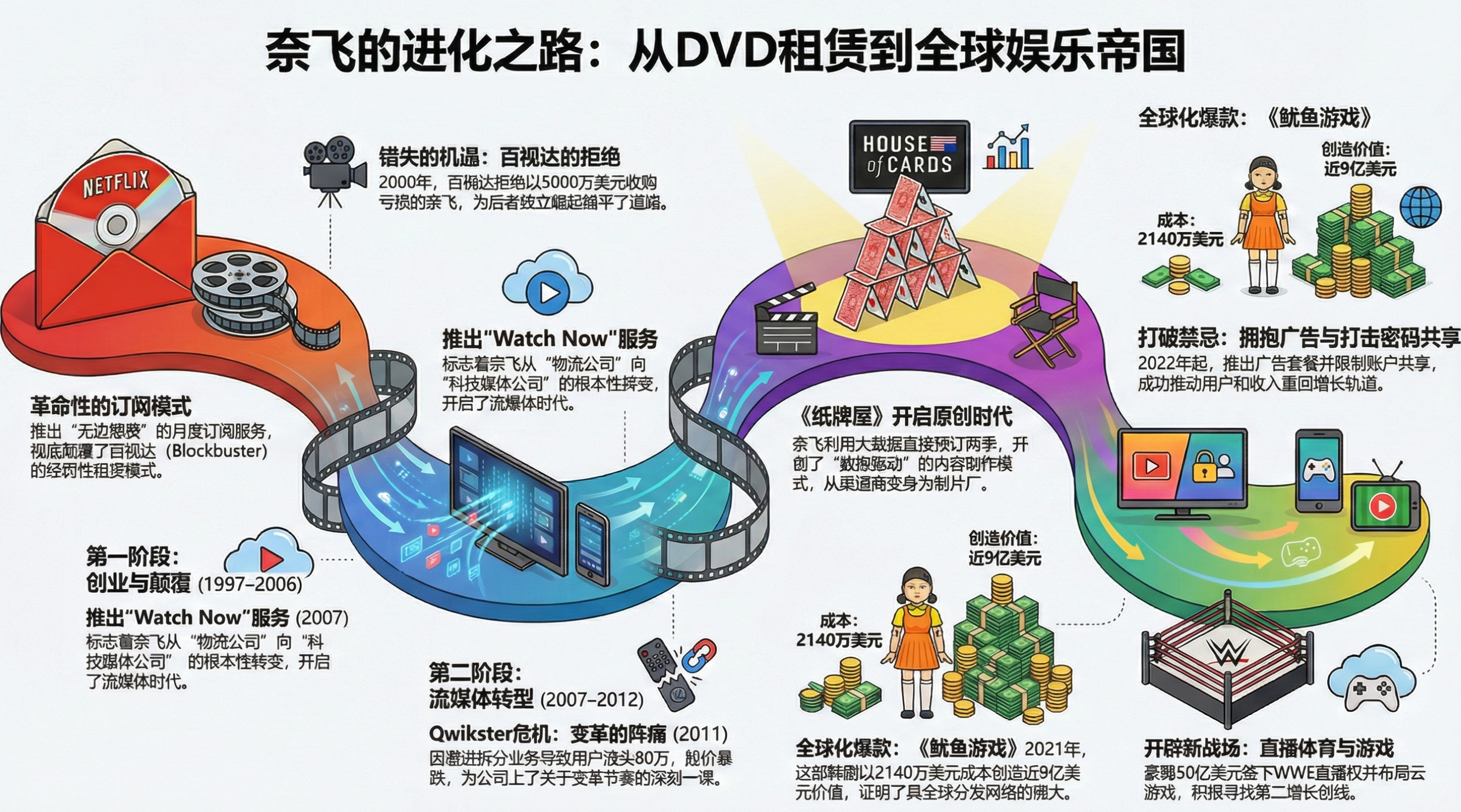 - Qwikster 危机与自我颠覆:2011 年,哈斯廷斯激进地将 DVD 业务和流媒体业务拆分(Qwikster 事件),导致股价暴跌 80%。虽然当时被视为灾难,但这实际上是 Netflix 为了拥抱流媒体未来而进行的必要“断臂求生”。