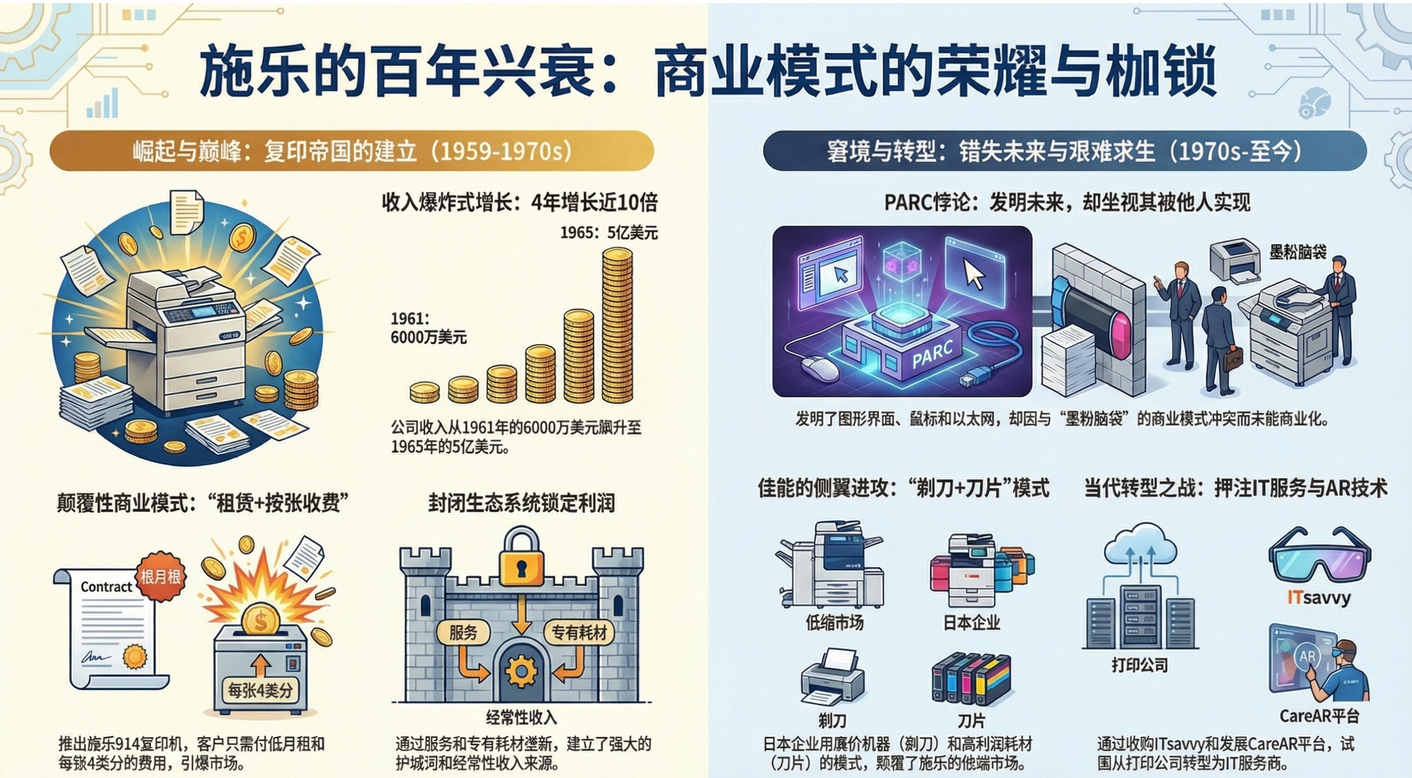 - 商业模式的革命:施乐914极其昂贵(造价高、售价高),根本卖不动。施乐天才般地推出了“租赁+计量收费”模式(只租不卖,每月收租金+按复印张数收费)。这不仅降低了客户门槛,还让施乐躺在“耗材”和“服务”上赚取了源源不断的超额利润,这比“剃须刀+刀片”模式更早也更暴利。
