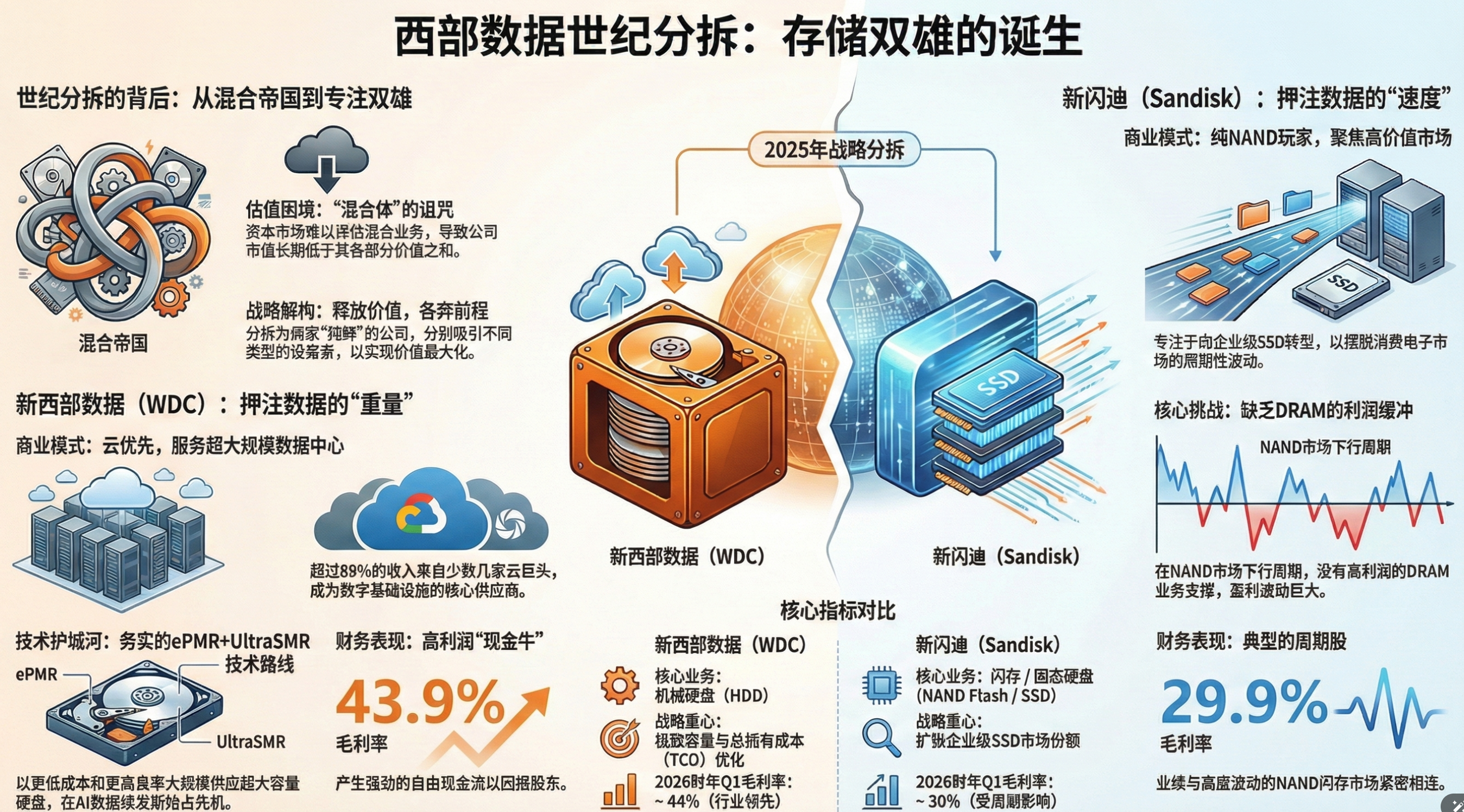 - 世纪分拆(The Spin-off):西部数据正式宣布将公司一分为二,拆分为专注于机械硬盘的 Western Digital 和专注于闪存/SSD 的 SanDisk(新闪迪)。这标志着过去十年试图整合 HDD 和 Flash 业务的“大一统”战略宣告失败。