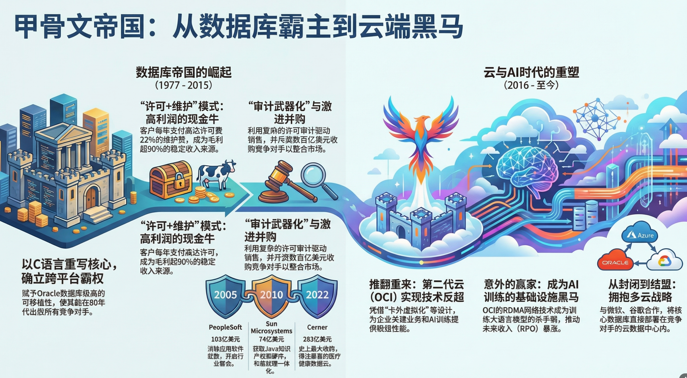 🎙️ 节目核心要点总结 硅谷的“成吉思汗” :拉里·埃里森的个人风格定义了甲骨文。不同于乔布斯的产品至上或盖茨的技术理想,埃里森信奉“仅仅获胜是不够的,其他人必须失败”。这种极度好斗的武士文化,使得甲骨文在商业竞争中无所不用其极。 起家的秘密:截胡 IBM :甲骨文的核心技术(关系型数据库 SQL)其实是 IBM 研究员特德·科德(Ted Codd)发明的。IBM 为了保护自家的旧业务没有将其商业化,而埃里森读到了这篇论文,抢先开发出了商用产品并卖给了 CIA(项目代号 Oracle),这是商业嗅觉对技术发明的胜利。 商业模式:金色手铐(Vendor Lock-in) :甲骨文最厉害的不是卖软件,而是收“维护费”。它的数据库极其难用且昂贵,但一旦企业将核心数据存入,迁移成本高到无法承受。这种“锁定”策略让甲骨文拥有了极高的利润率和现金流。 并购狂魔的逻辑 :2000 年后,甲骨文开启了疯狂的并购模式(耗资数百亿美元收购 PeopleSoft、Siebel、BEA 等)。最经典的是收购 Sun Microsystems,虽然硬件业务是个烂摊子,但甲骨文拿到了 Java 的控制权,从此扼住了全球软件开发的咽喉。 云时代的掉队与 OCI 的反击 :埃里森曾嘲笑云计算是“时尚”,导致甲骨文错失先机。后来他痛定思痛,挖角 AWS 团队开发了第二代云架构(OCI)。不同于亚马逊和微软的通用云,OCI 主打“高性能”和“裸金属”,通过与英伟达(NVIDIA)的深度绑定,试图在 AI 训练算力市场上弯道超车。 ⏱️ 关键章节标题与时间戳 00:17 甲骨文成功的驱动力:技术还是商业?