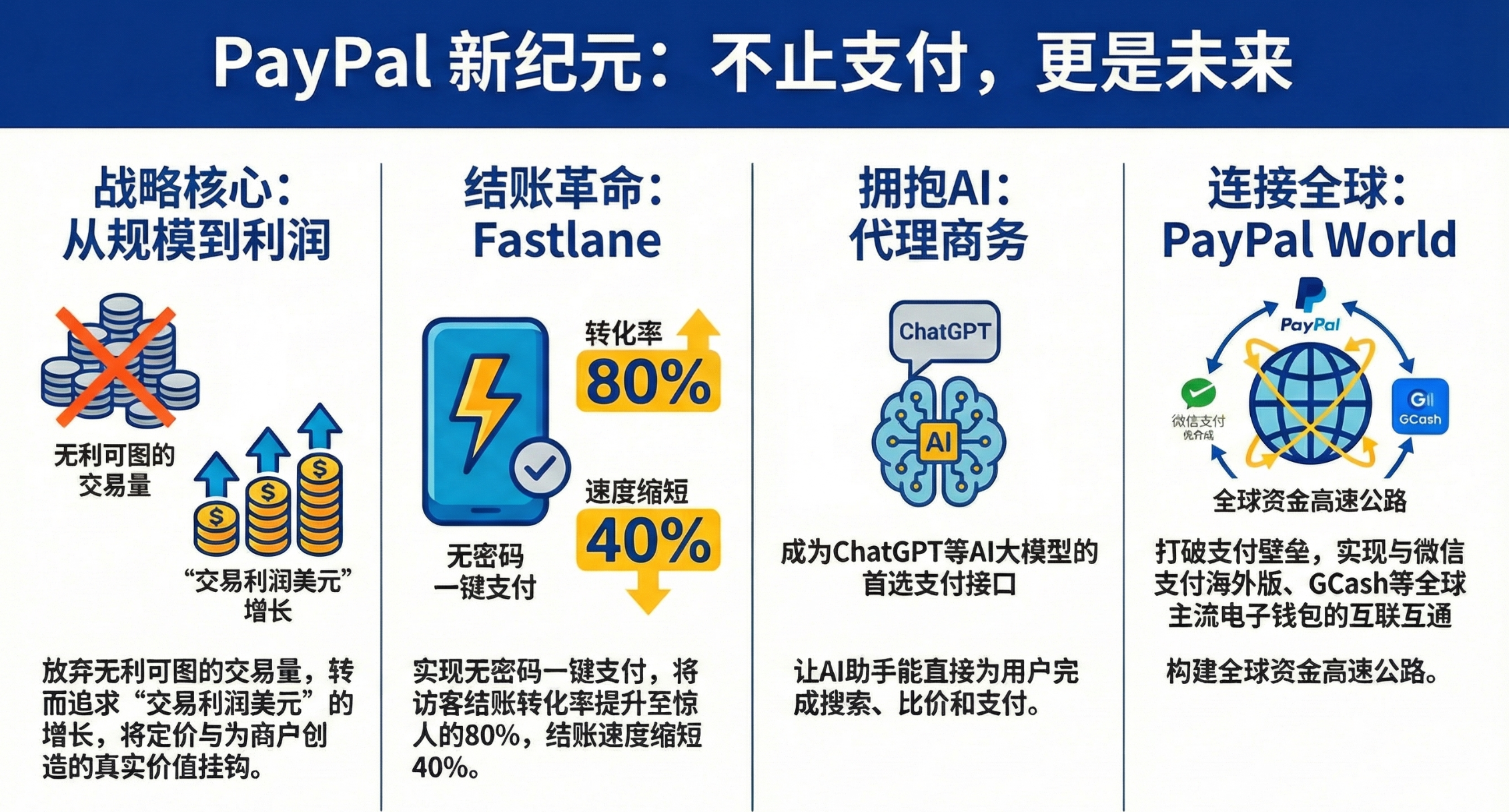 - 数据金矿的挖掘:PayPal 拥有极其独特的数据优势——它既知道谁买了(消费者端),也知道买了什么(商家端),这是银行卡组织(只知道金额)和电商平台(只知道单一平台数据)都不具备的全景视角。新战略核心就是利用 AI 挖掘这 1.5 万亿美元交易流背后的数据价值。