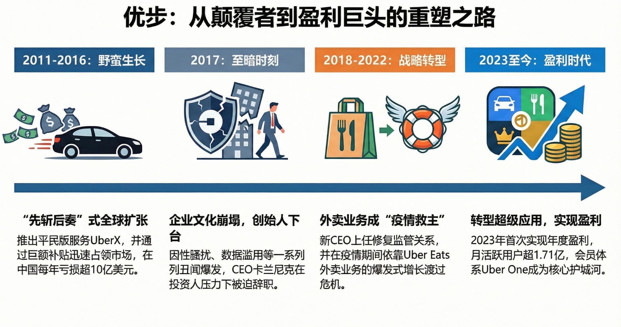 - 核心议题:Uber 从一个简单的打车软件发展成为全球科技巨头,其背后的商业模式、战略决策、面临的挑战以及未来的发展方向。