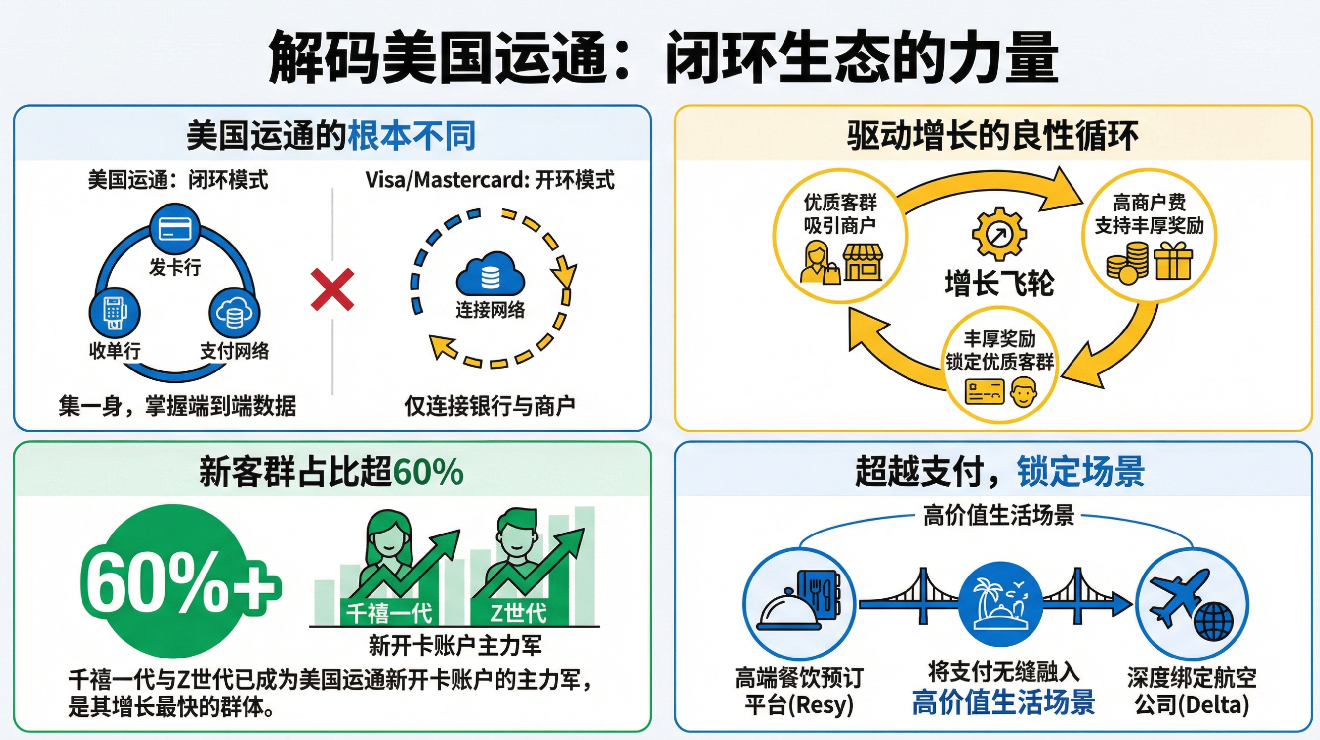 核心议题:美国运通如何吸引年轻一代,并构建一个涵盖生活场景的生态系统。 关键论点: 运通通过提供超越年费的权益和体验价值,吸引价格敏感度低的年轻高端客户。 年费收入成为稳定的订阅制收入来源。 运通积极构建生态系统,与达美航空、Resy等合作,提供航空里程、餐饮预订等专属福利,将支付卡重塑为“生活方式通行证”和“社交资本”。 这种深度绑定提高了用户转换成本,使其难以离开。 成功锁定“Henry”(高收入但尚未富有)人群,培养其忠诚度,挖掘终身价值。 节目总结: 本期节目深入剖析了美国运通174年的商业发展历程,展现了一个从快递公司到金融巨头的传奇转型。节目强调了信任、危机应对和创新在其发展中的关键作用。通过详细解读其独特的“闭环商业模式”和“以消费为中心”的飞轮策略,揭示了运通如何通过筛选高端客户、收取高额商户手续费、提供丰厚福利,并掌握完整交易数据,实现持续盈利和增长。特别值得关注的是,运通成功吸引了年轻一代,并通过构建涵盖航空、餐饮等生活场景的生态系统,将支付卡升级为生活方式通行证和社交资本,从而在激烈竞争中保持领先地位。节目最后提出了一个引人深思的问题:在人工智能时代,运通所拥有的庞大而完整的消费数据,将如何被利用,又将带来怎样的机遇与挑战?
