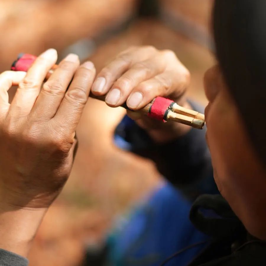 这种乐器大多用金竹制作,演奏时将两个簧管含入口中,吐气发声。它的演奏特点是通过嘴部拉进拉出控制音高,即使只有几个孔,也能吹出丰富的音色。