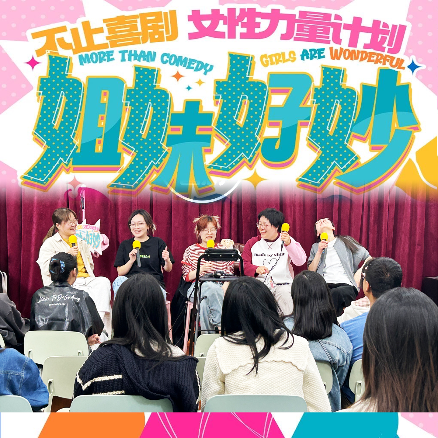 朋友们好呀,乘着国际劳动妇女节的东风,咱「不止喜剧」在3月做了一整个月的女性力量计划,主题是「姐妹好妙」,哈哈传达室也做了关于女性自我表达的工作坊,几位单口和即兴的女演员跟姐妹们一起聊了聊上台的事(看着怪像给开放麦招新的),总之希望越来越多的女性加入我们,走上台来!The more the better,女人越多喜剧越好!