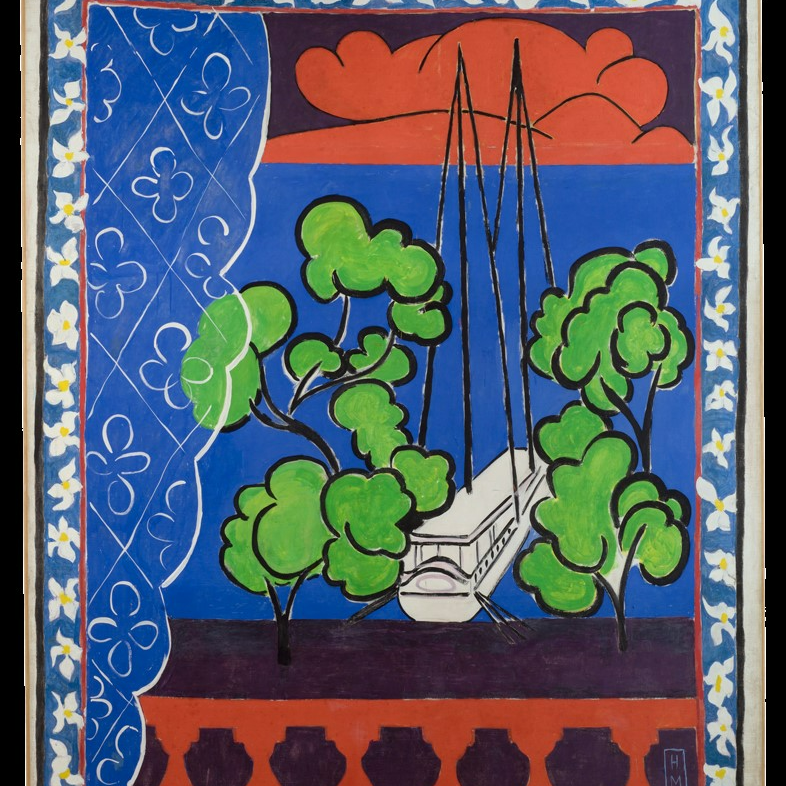 《塔希提岛之窗或塔希提岛II》,1935年12月18日-1936年3月15日于尼斯市,布面不透明水彩和蛋彩,238 × 183 cm,法国北方省省立马蒂斯美术馆,勒卡托-康布雷齐。艺术家捐赠,1952年,Inv. 1952-63。图片由法国北方省省立马蒂斯美术馆,菲利普·伯纳德提供
