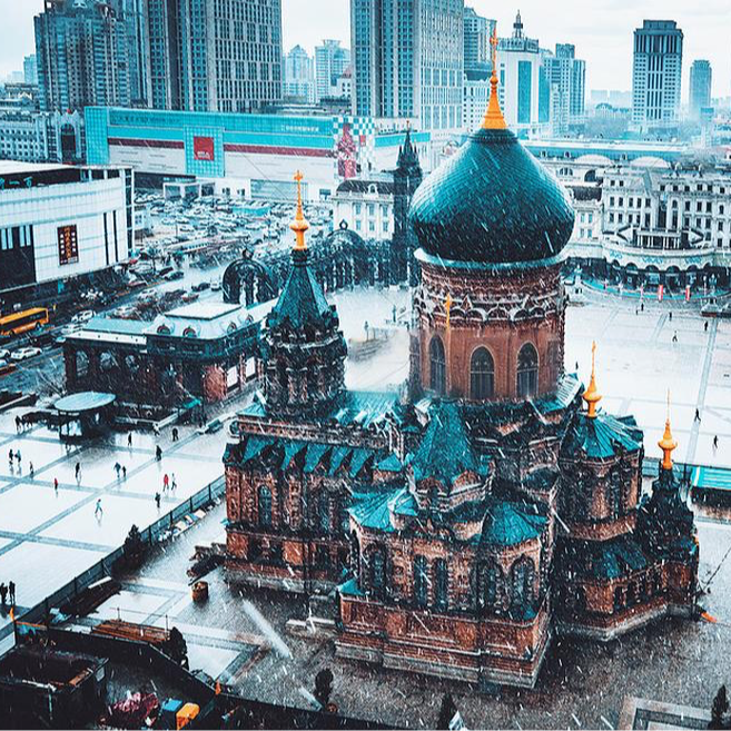 哈尔滨体院的帅哥也出来接待南方小土豆,鄂伦春族也被召唤出来的,带翅膀的马走在中央大街,你都有一种不真实感,甚至在索菲亚大教堂上人造了一轮月亮。