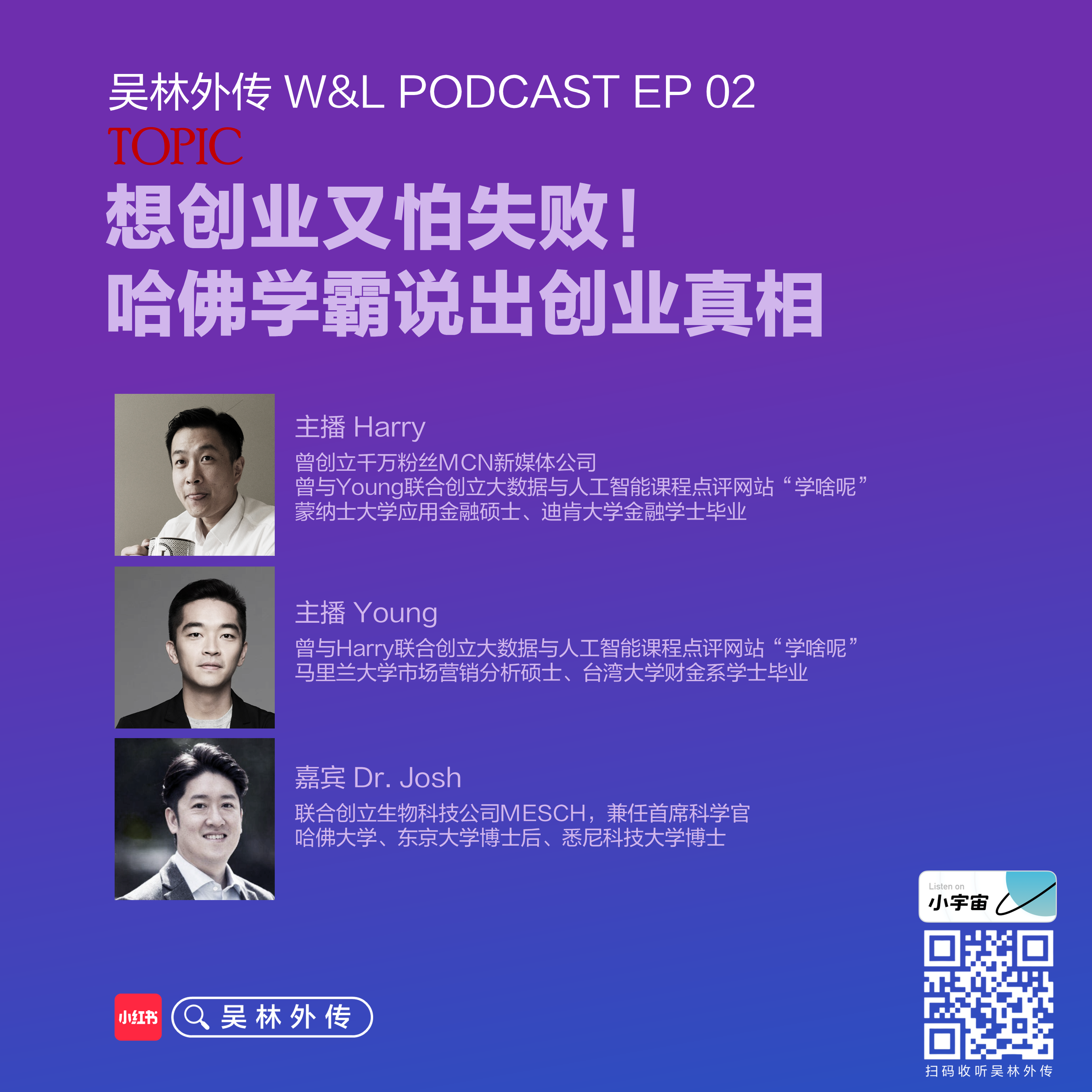 第二期节目,Young和Harry邀请了来自澳洲的Josh博士一起聊聊年轻人创业的话题。Josh有着哈佛大学、悉尼科技大学等名校学术背景,创立了多家生物科技公司,所以Young和Harry希望让这位优秀的创业者和大家分享一下年轻人到底要不要创业的话题,当然Young和Harry也会分他们各自的创业故事。