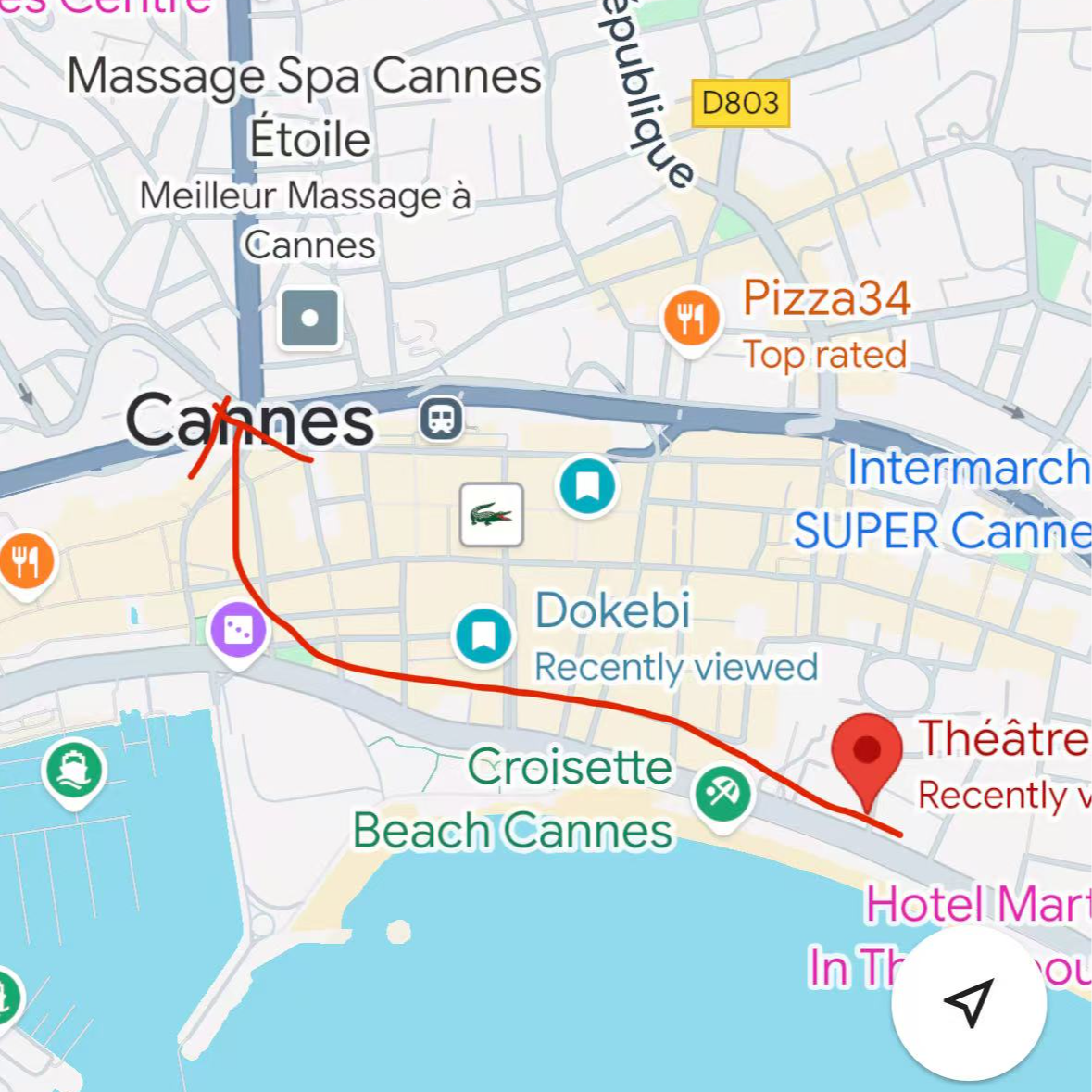 这是一期「影迷的戛纳语音导览」,你会跟着Selina从影人双周的电影院走到主电影宫(卢米埃尔&德彪西),途经沙滩、冰淇淋店、餐厅和店铺。这是影迷每天都会往返的路线,地图如下: