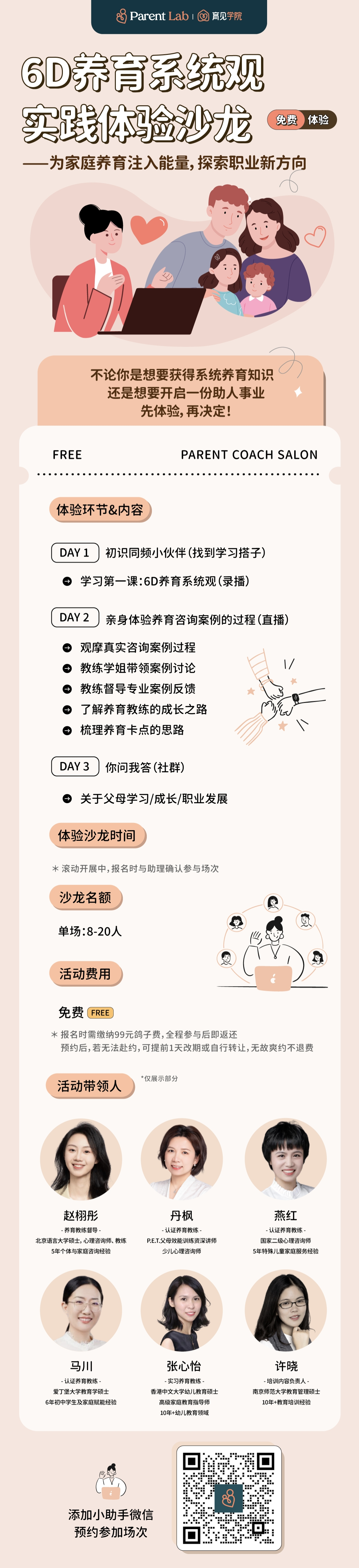 真的,不能再多说了,Parent Lab【免费】沙龙课程不去白不去啊!为了保证参与度和良好的体验效果,沙龙体验会先收取一个99元占位费,参与后会全额退款,大家可以保存下面↓的图片,微信扫码添加小助手预约沙龙时间!