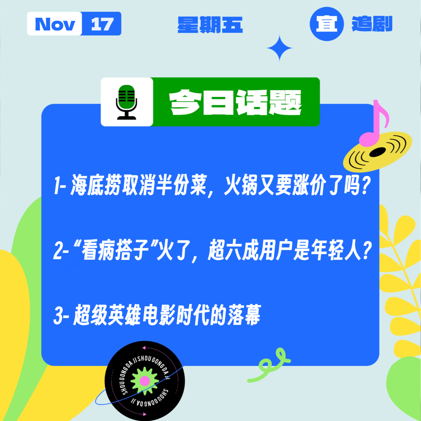 今天是11月17日,星期五,《收工大吉》今日陪你聊:
