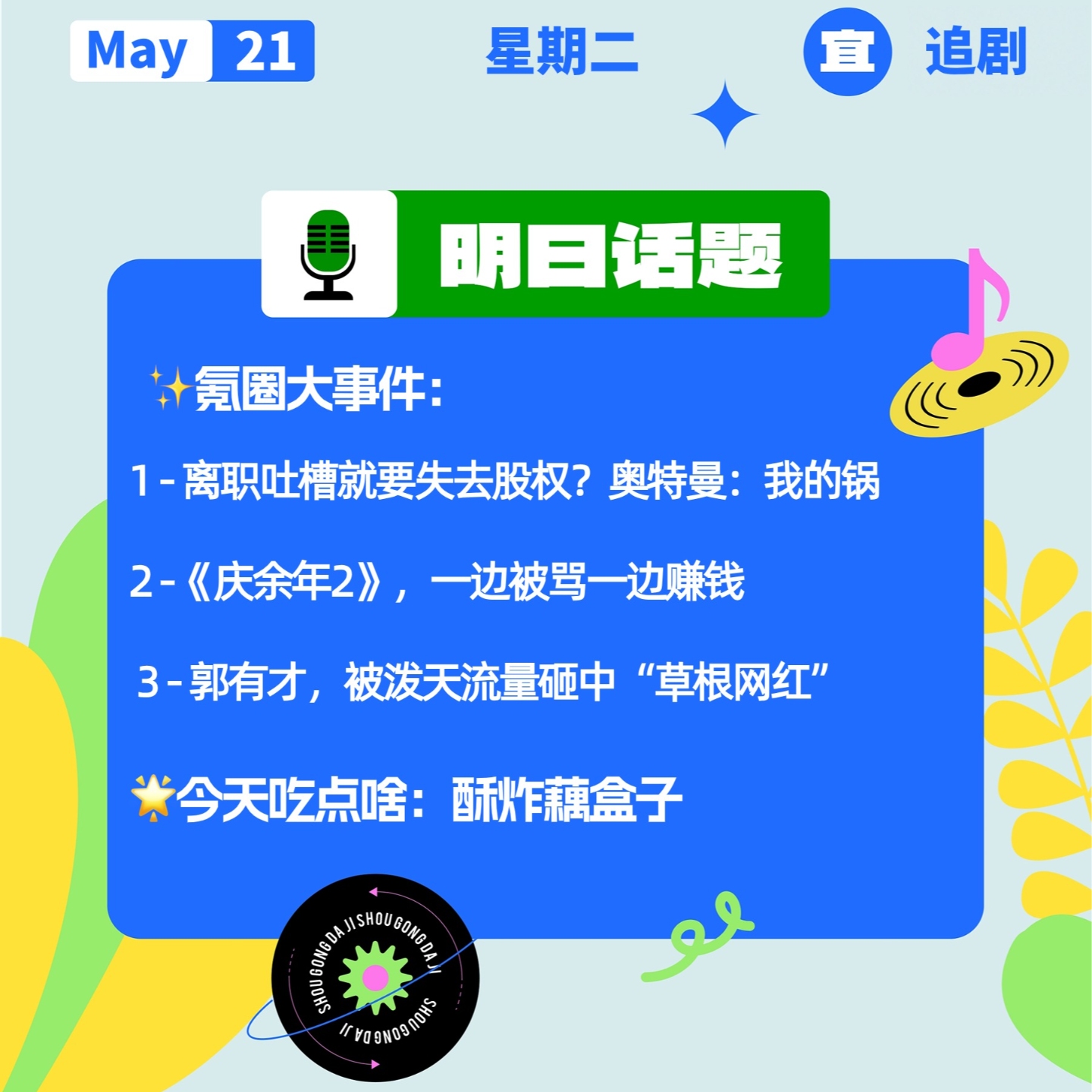 今天是5月21日,星期二,《开工大吉》今日陪你聊: