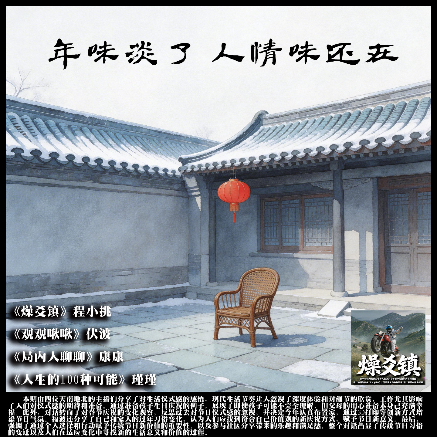 本期由四位天南地北的主播们分享了对生活仪式感的感悟,现代生活节奏让人忽视了深度体验和对细节的欣赏,工作尤其影响了人们对仪式感的期待和准备。通过准备孩子生日庆祝的例子,展现了即使孩子可能不完全理解,但父母的用心准备本身已充满幸福。此外,对话转向了对春节庆祝的变化观察,反思过去对节日仪式感的忽视,并决定今年认真布置家,通过3D打印等创新方式增添节日气氛。福波还分享了自己和家人的过年习俗变化,认为人们应找到符合自己价值观的新庆祝方式,赋予节日新意义。最后,强调了通过个人选择和行动赋予传统节日新价值的重要性,以及参与社区分享带来的乐趣和满足感。整个对话凸显了传统节日习俗的变迁以及人们在适应变化中寻找新的生活意义和价值的过程。