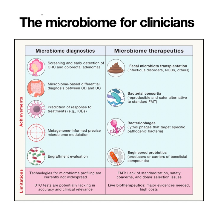 This paper discusses the current state and challenges of microbiome research in clinical medicine. Despite the enormous potential of the microbiome in diagnosis and treatment, its widespread adoption in clinical practice still faces obstacles, for example, fecal microbiota transplantation (FMT) has been approved for Clostridioides difficile infection, but remains at the research stage for other indications. The article emphasizes the importance of standardizing research methods, improving clinical trial design, and strengthening communication between microbiome researchers and clinicians in order to more effectively translate microbiome science into clinical applications.